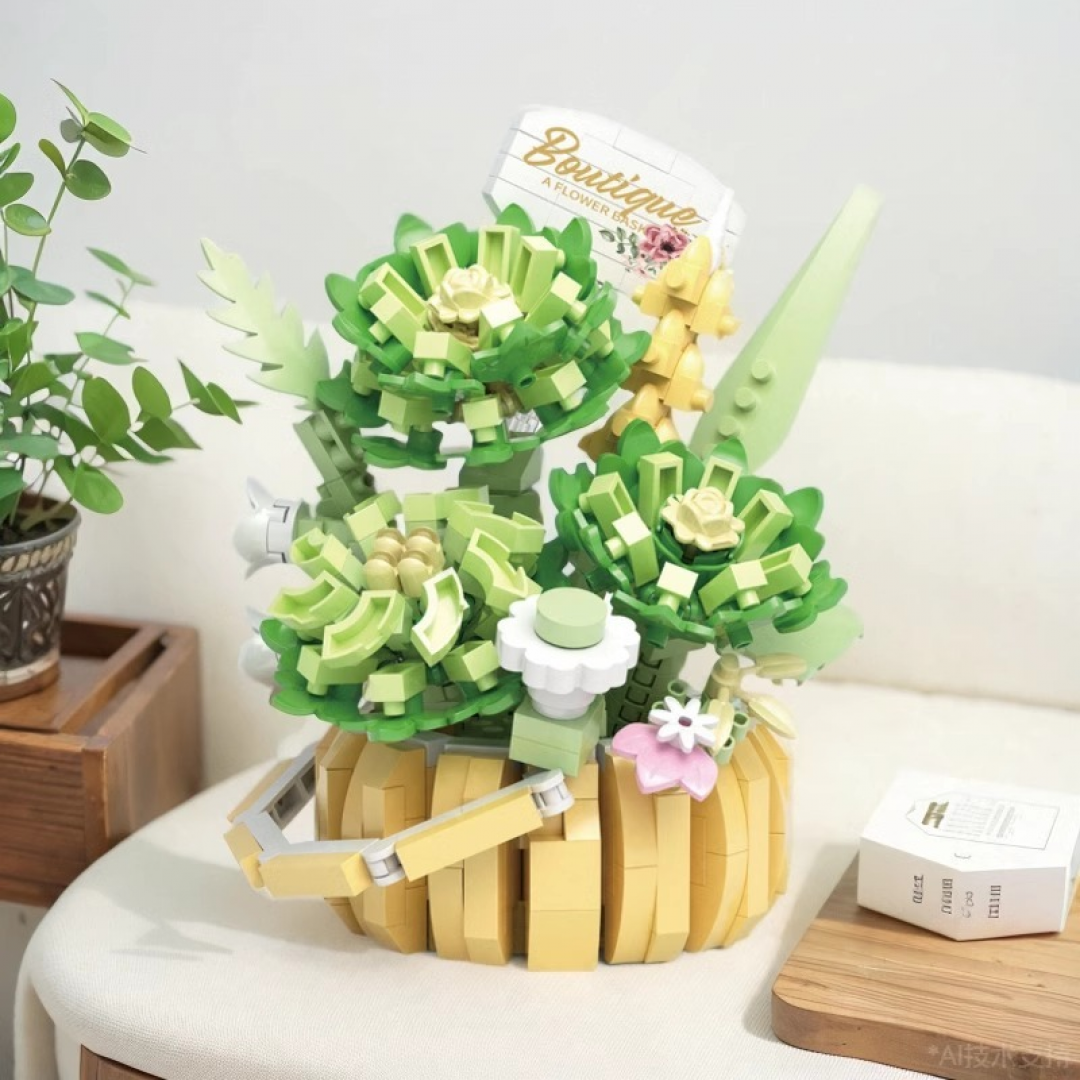 Конструктор представляет собой декоративную композицию в виде цветочной корзины с объемными растительными элементами, выполненными преимущественно в зелёной цветовой гамме. Модель собирается из отдельных пластиковых деталей и предназначена для создания интерьерного декоративного объекта.