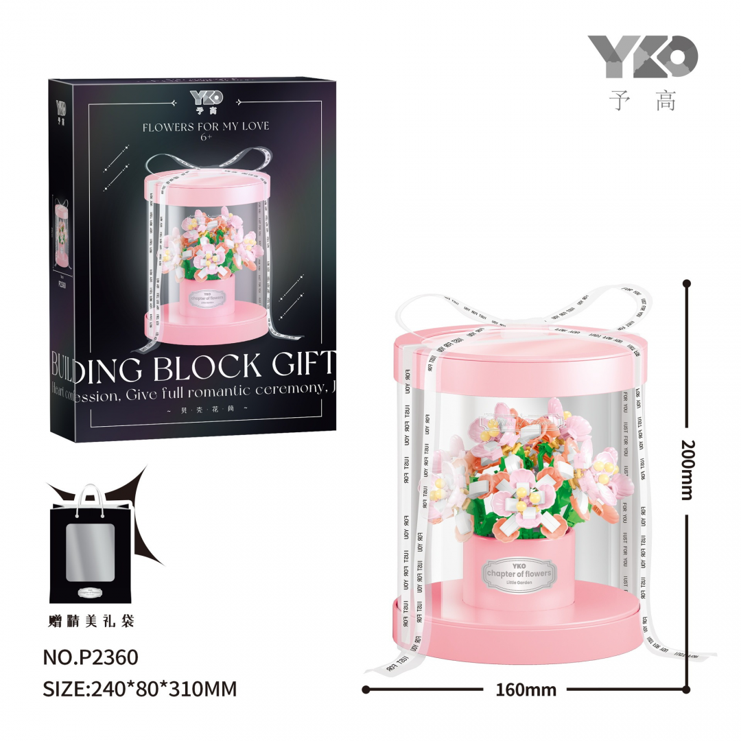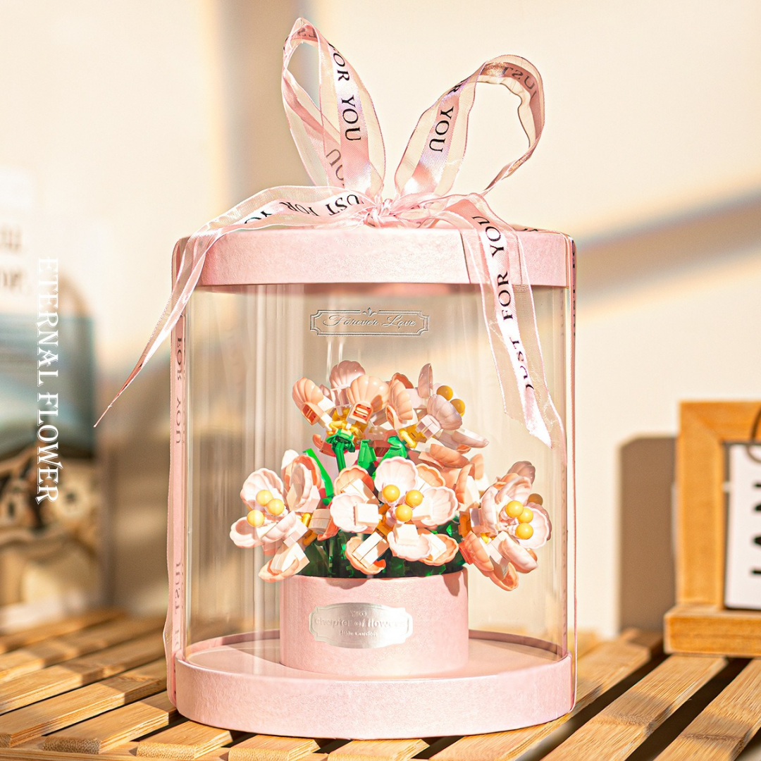Конструктор представляет собой декоративную цветочную композицию, собранную из отдельных пластиковых деталей, выполненную в виде букета розовых роз с декоративными элементами, стилизованными под лепестки. Модель размещена внутри прозрачного цилиндрического колпака с основанием и предназначена для интерьерного использования.