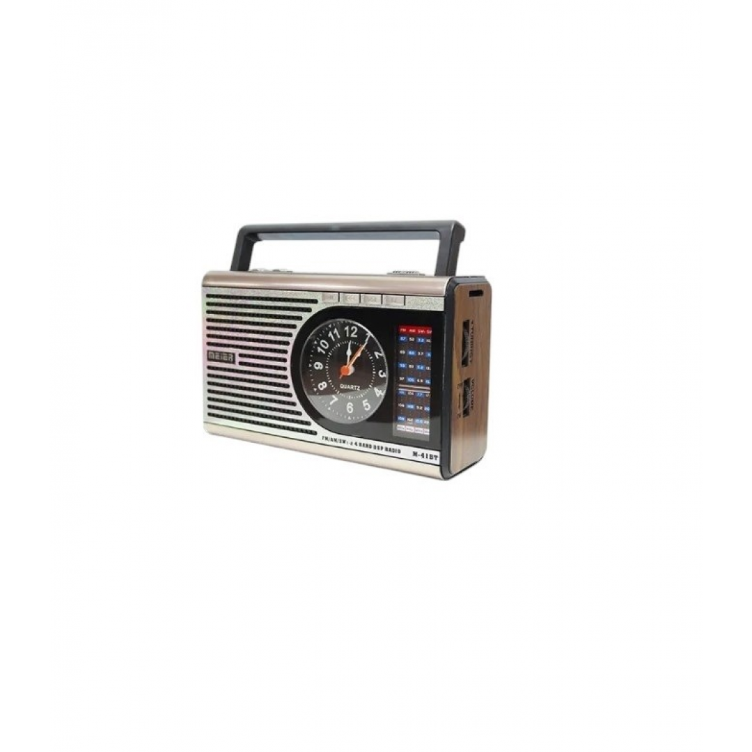 Портативный радиоприемник M 41BT представляет собой многофункциональное устройство, сочетающее в одном корпусе радиоприемник, часы, Bluetooth-модуль и светодиодный фонарик. Модель оснащена аналоговыми органами управления, что обеспечивает простоту настройки громкости и радиочастот.