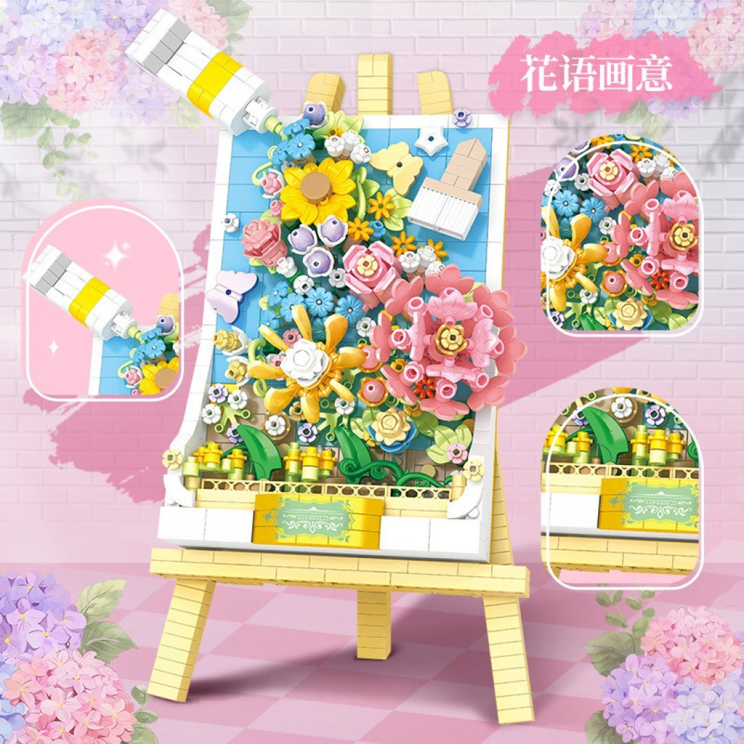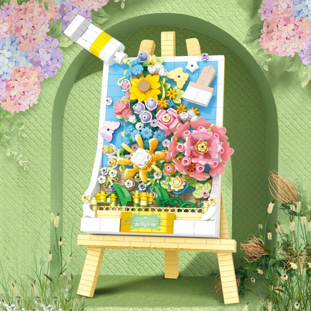 Декоративный конструктор в виде цветочного панно, установленного на мольберт. Модель представляет собой объёмную композицию из цветов и декоративных элементов, выполненных из строительных блоков. Предназначен для сборки и дальнейшего использования как интерьерное украшение.