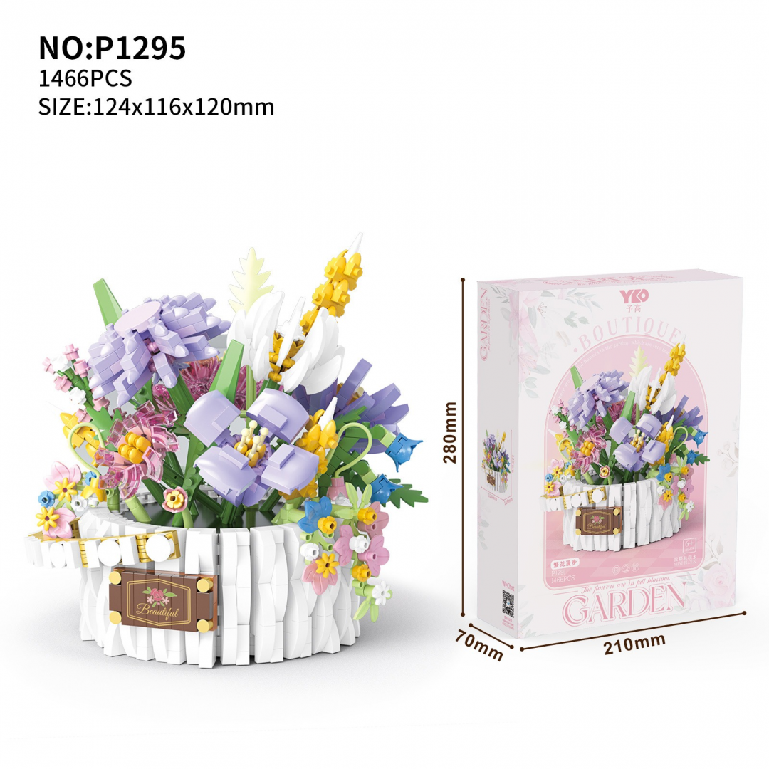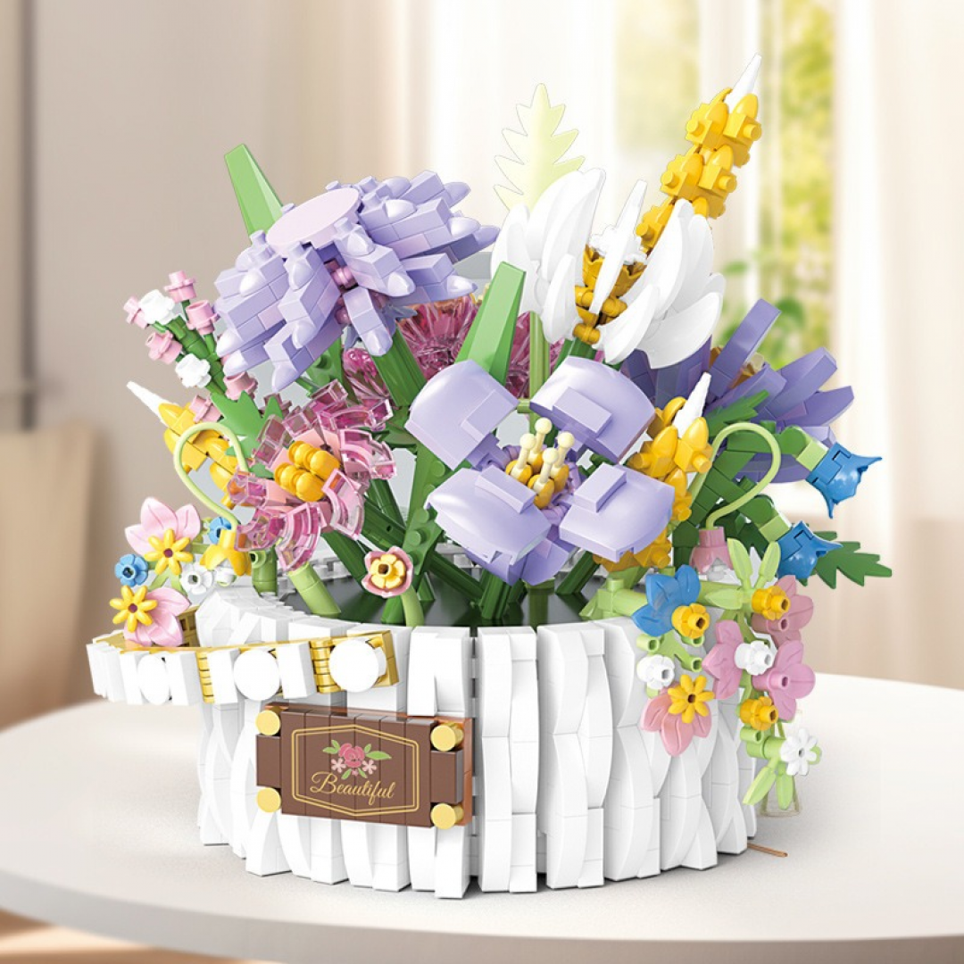 Декоративный конструктор в виде цветочной композиции, размещённой в круглой корзине. Модель представляет собой насыщенный букет с различными видами цветов, листьев и декоративных элементов, собранных из строительных блоков. После сборки используется как самостоятельный интерьерный объект.
