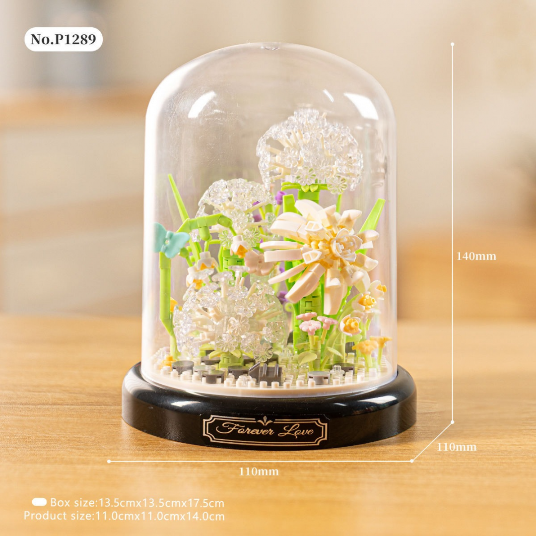 Декоративный конструктор в виде композиции с белыми одуванчиками, размещённой под прозрачным куполом. Модель собирается из мини-блоков и предназначена для интерьерного размещения. После сборки изделие не требует ухода и сохраняет аккуратный внешний вид.