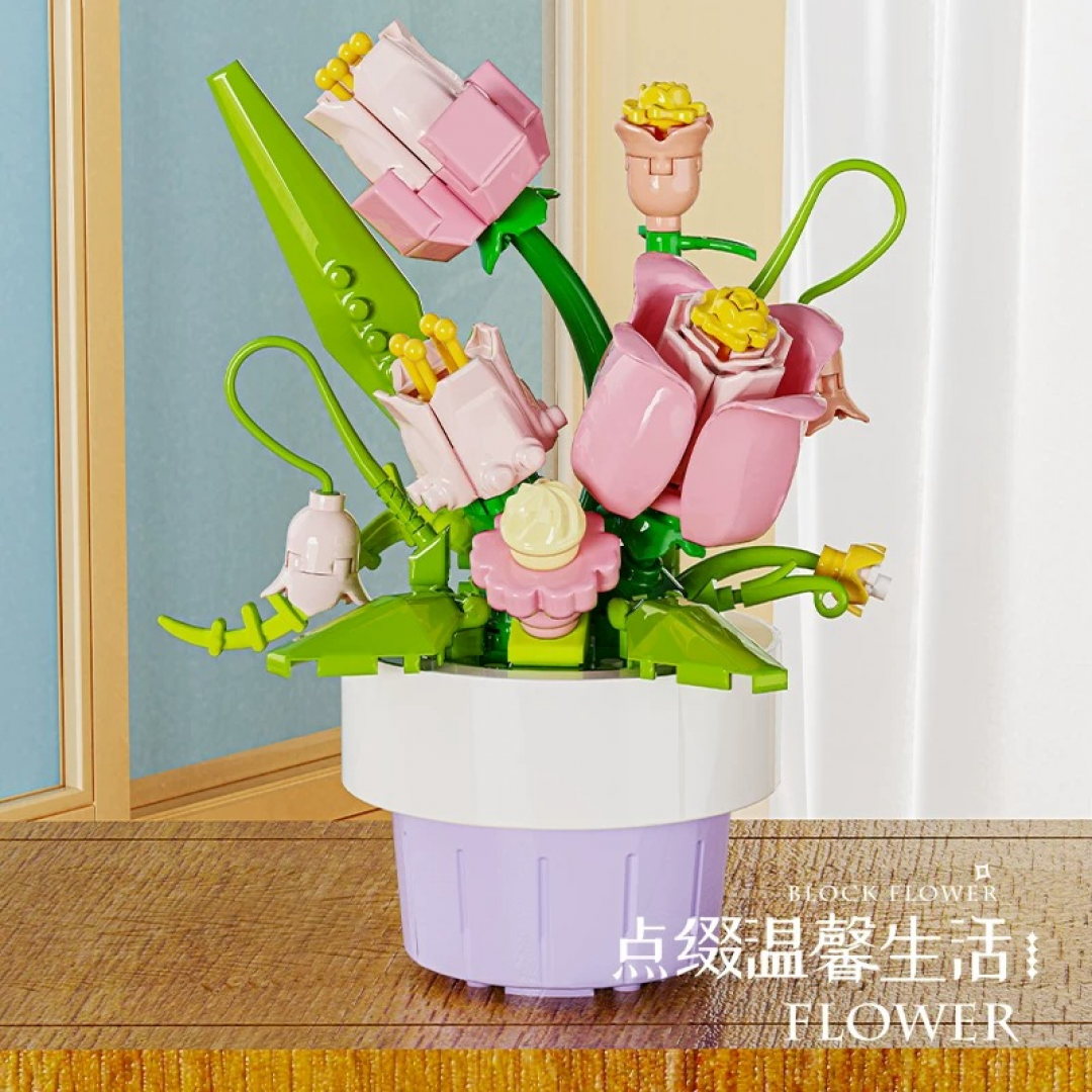 Декоративный конструктор в виде цветочной композиции с розовыми бутонами в компактном горшке. Модель предназначена для сборки и последующего использования в качестве интерьерного украшения. Подходит для спокойной сборки и аккуратного размещения на полке, столе или подоконнике.