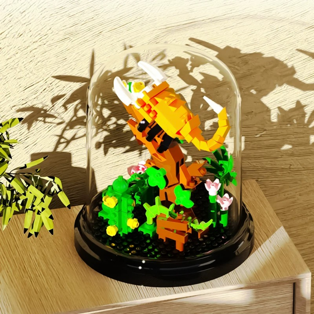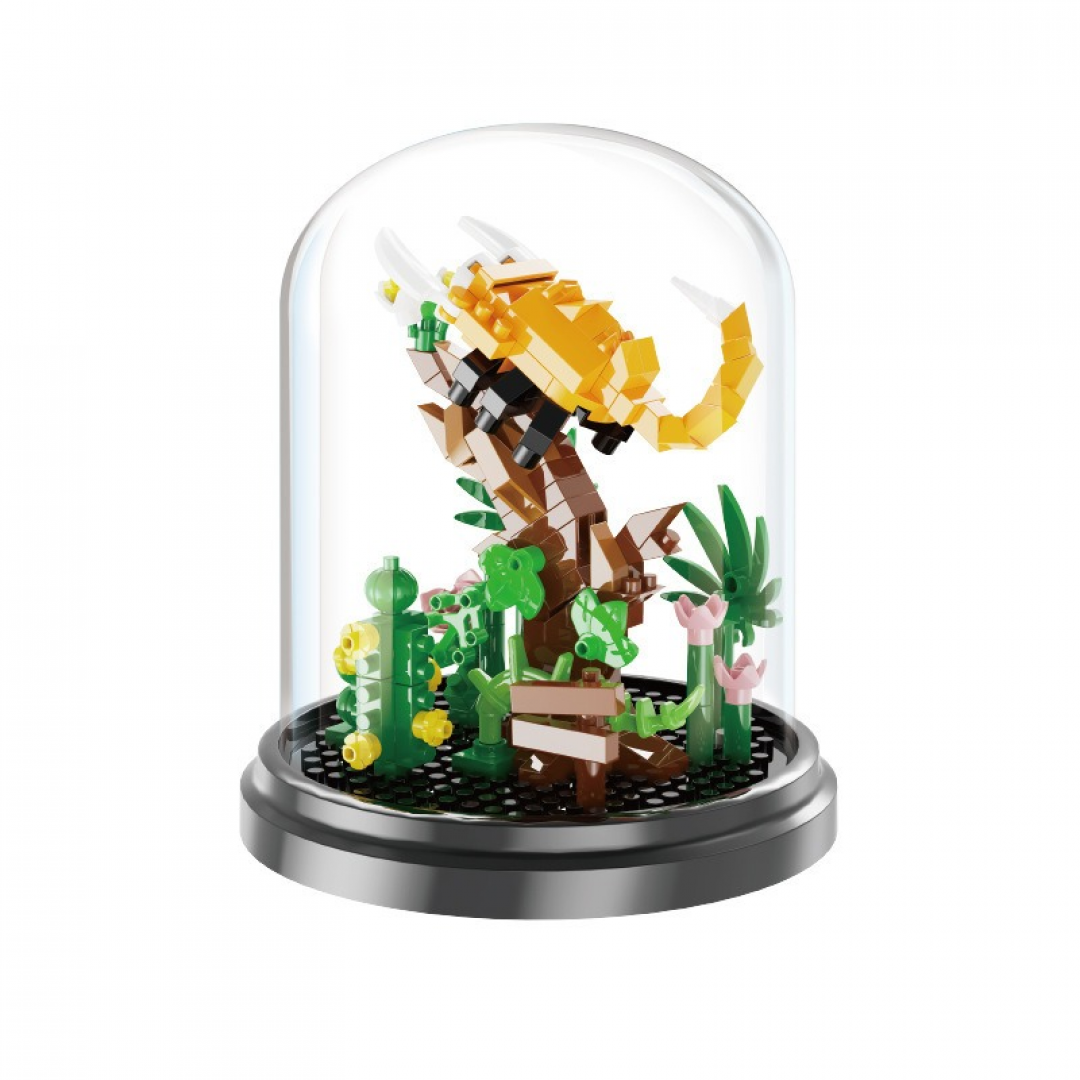 Декоративный конструктор мини-блоков для сборки объемной композиции со скорпионом под прозрачным куполом. Модель выполнена в виде стилизованной сцены с растительностью и деревянной табличкой, предназначена для размещения в интерьере как декоративный элемент. После сборки не требует ухода.