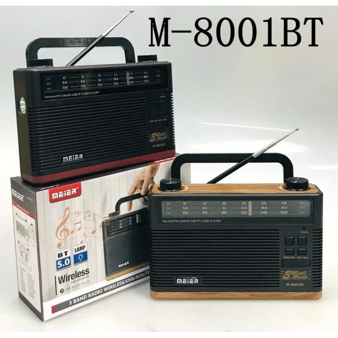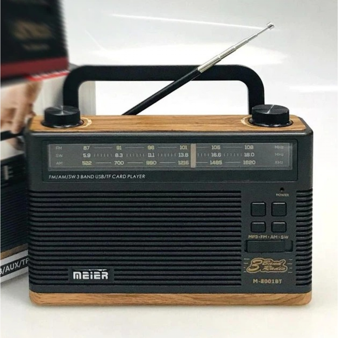 Meier M-8001BT — аккумуляторный радиоприёмник в классическом корпусе, сочетающий функции радио, беспроводной колонки и портативного аудиоустройства. Поддерживает приём радиостанций в диапазонах AM, FM и SW, воспроизведение музыки по Bluetooth и через AUX-вход. Оснащён встроенным динамиком и фонариком, подходит для использования дома, на даче или в поездках.
