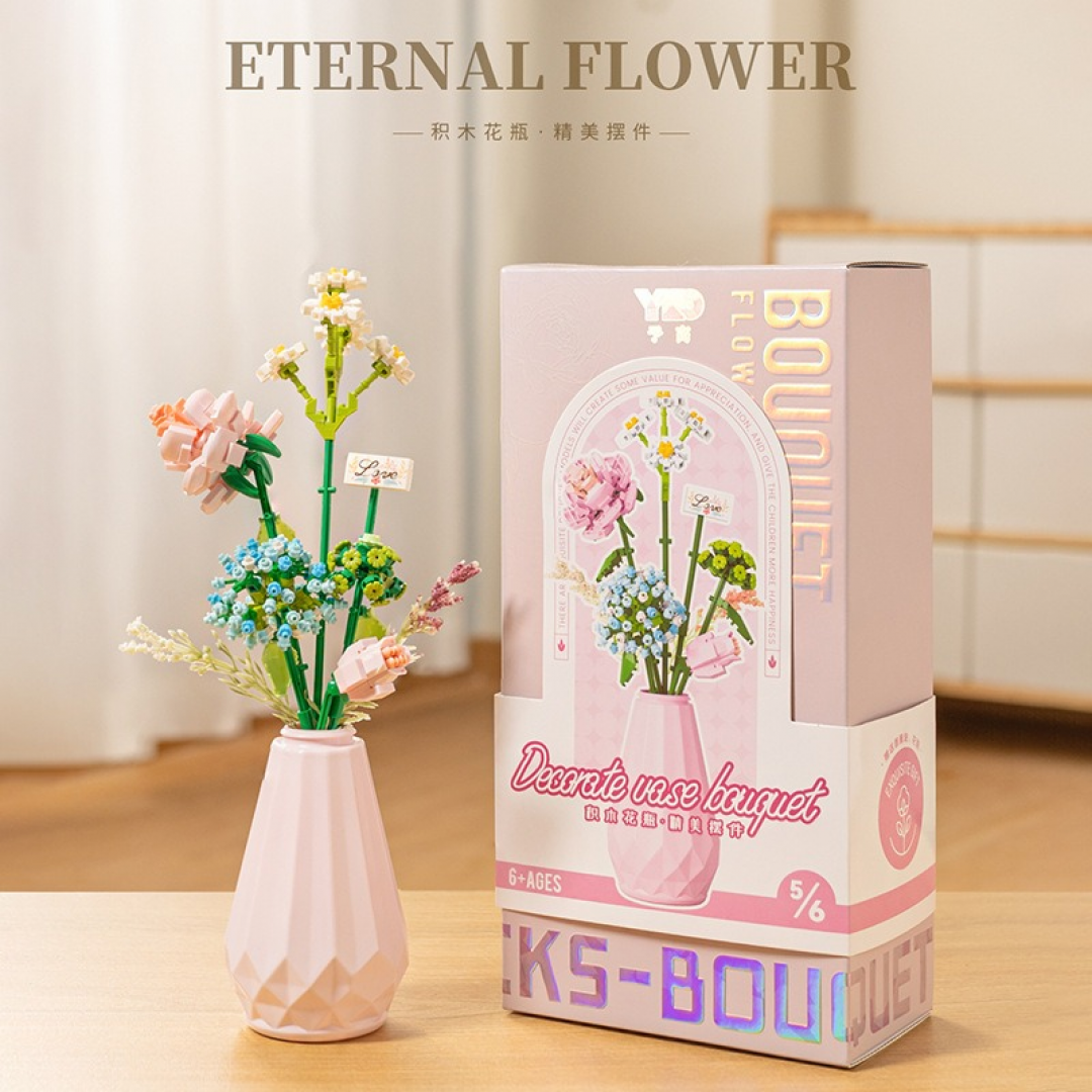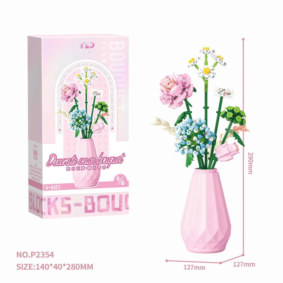 Декоративный конструктор в виде цветочной композиции в розовой вазе. После сборки модель представляет собой интерьерный элемент, подходящий для украшения дома или рабочего пространства. Все элементы выполнены из пластиковых мини-блоков и фиксируются в устойчивой вазе.