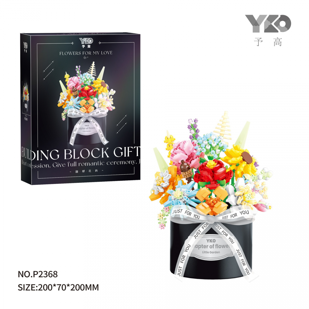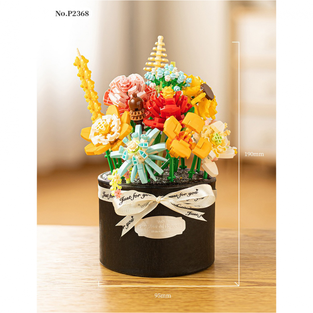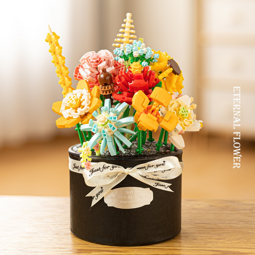Декоративный конструктор в виде пышного цветочного букета в круглой коробке. Композиция выполнена из строительных блоков и предназначена для интерьерного декора. После сборки изделие сохраняет форму и не требует ухода.
