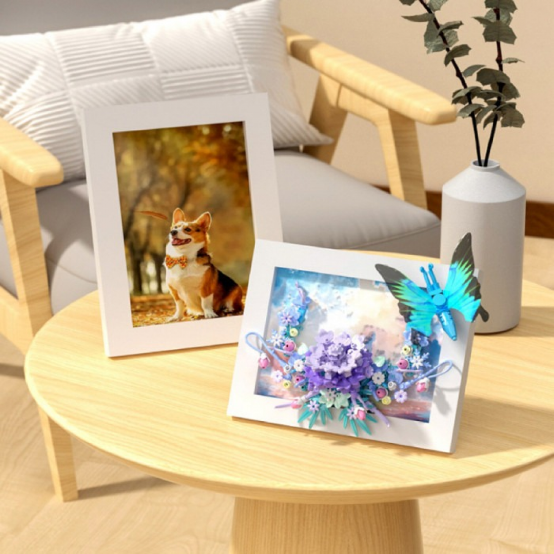 Декоративный конструктор в виде фоторамки с объемной цветочной композицией и фигурой бабочки. После сборки изделие используется как интерьерное украшение и фоторамка для размещения изображения.