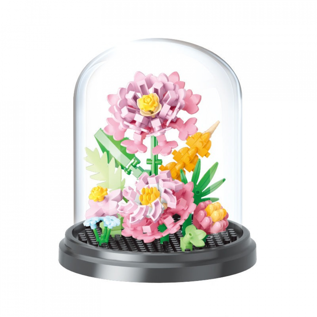 Декоративный конструктор в виде цветочной композиции под прозрачным колпаком. После сборки изделие представляет собой интерьерное украшение, подходящее для размещения на столе, полке или подоконнике.