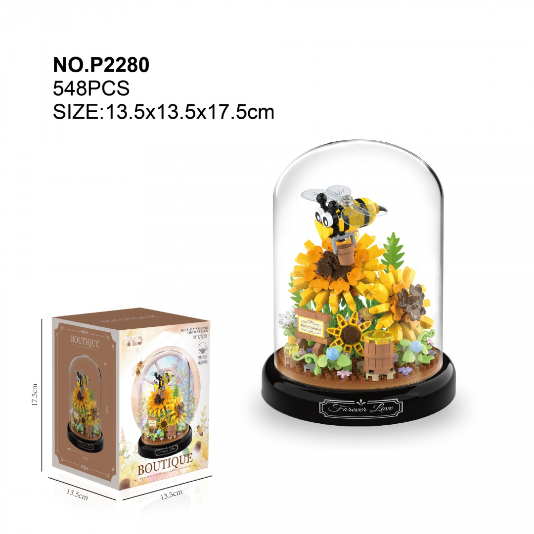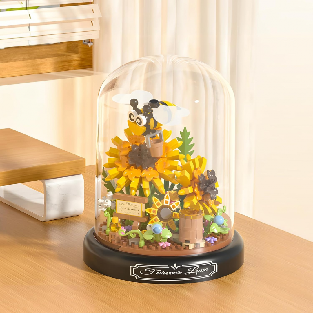 Декоративный конструктор в виде композиции с подсолнухами и пчёлами, размещённой под прозрачным куполом. После сборки модель служит интерьерным элементом для дома или рабочего пространства. Подходит для спокойной, вдумчивой сборки и последующего размещения в качестве украшения.