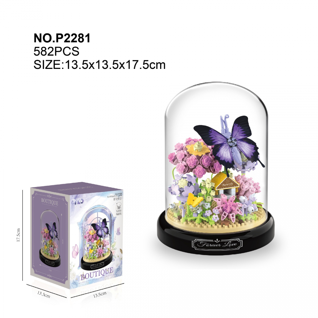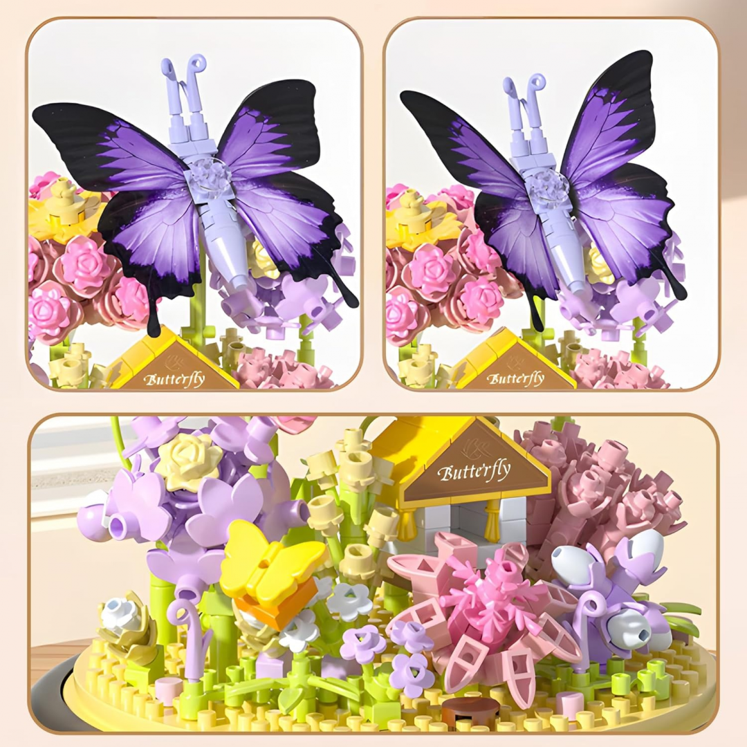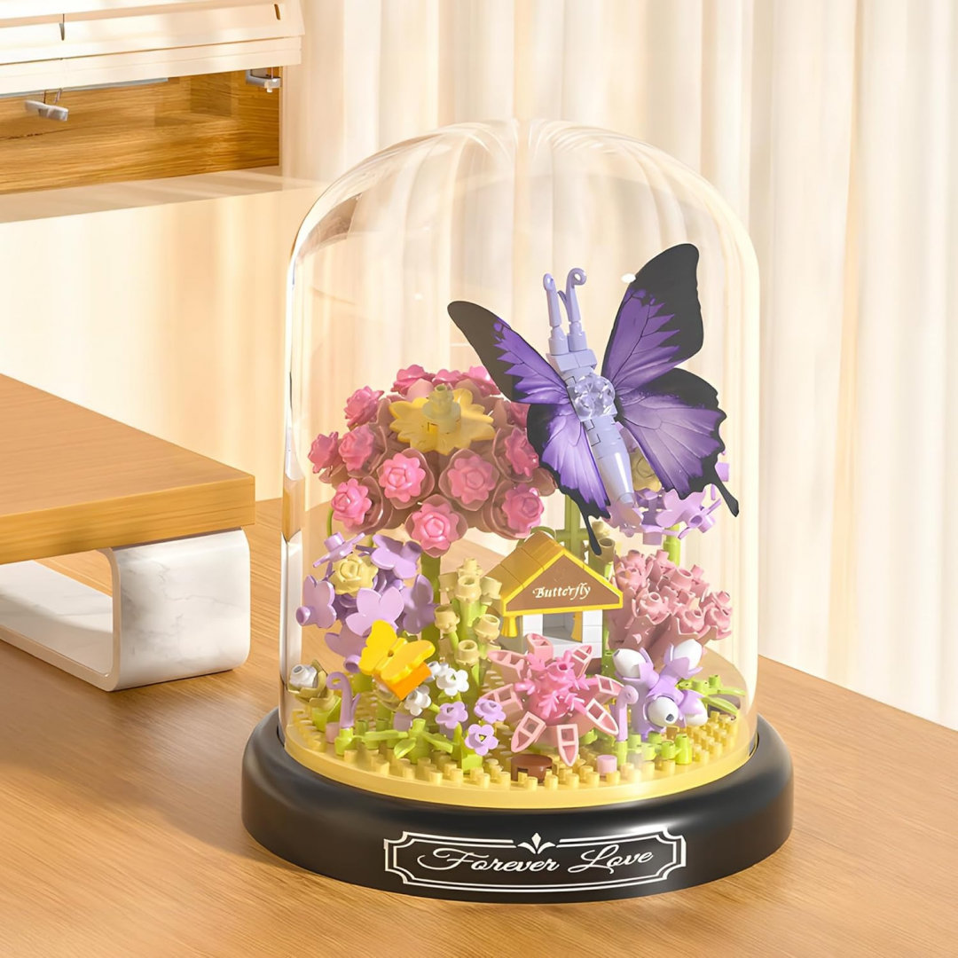Конструктор выполнен в виде миниатюрного цветочного сада с объёмными цветами и бабочкой, установленными на круглой подставке и закрытыми прозрачным защитным куполом. Детализированная сборка и продуманная композиция делают модель устойчивой и визуально завершённой. Подходит для сборки детьми и взрослыми, а также для использования в качестве подарка или декоративного аксессуара.