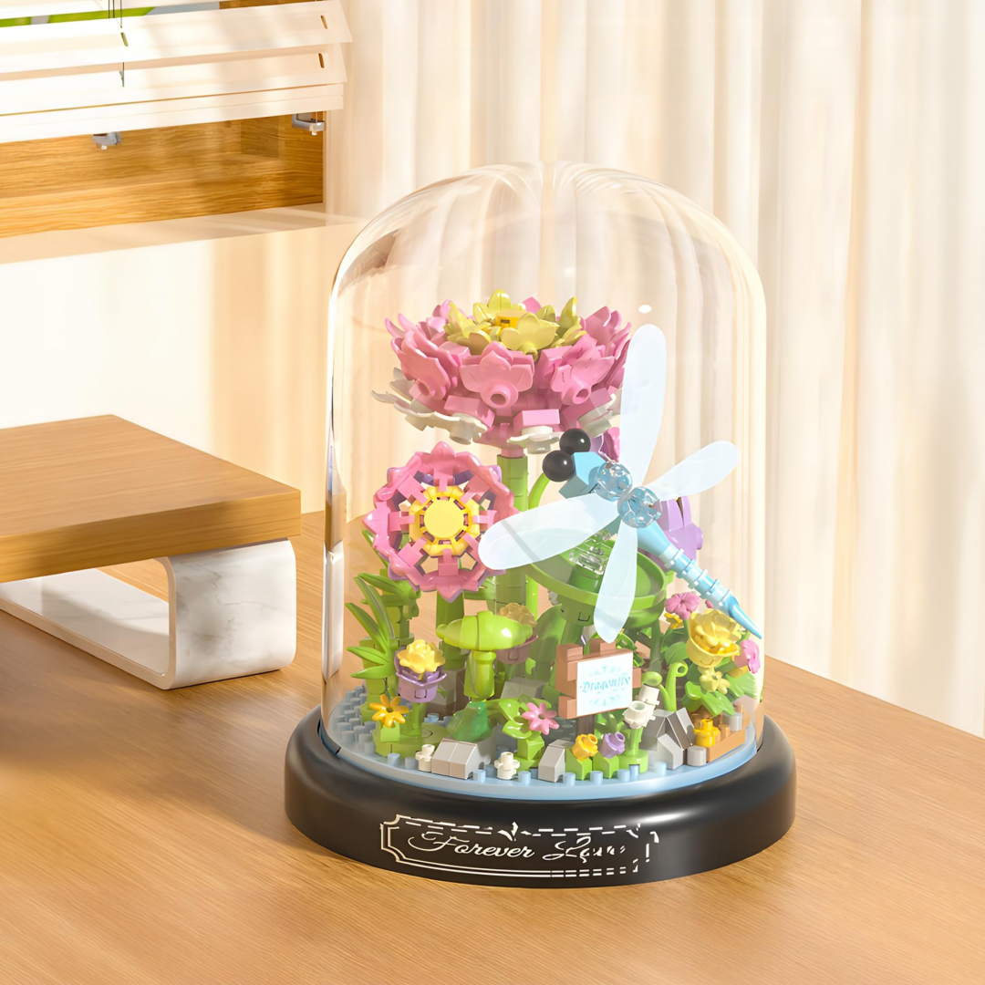 Декоративный конструктор в виде композиции с цветком лотоса и стрекозой, размещённой под прозрачным защитным куполом. После сборки модель служит интерьерным элементом и подходит для оформления полки, стола или витрины.
