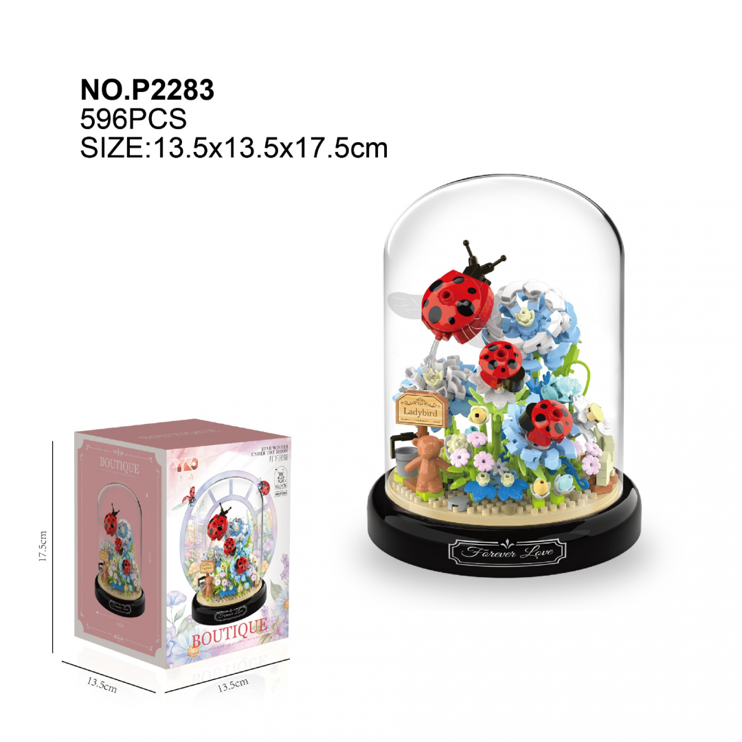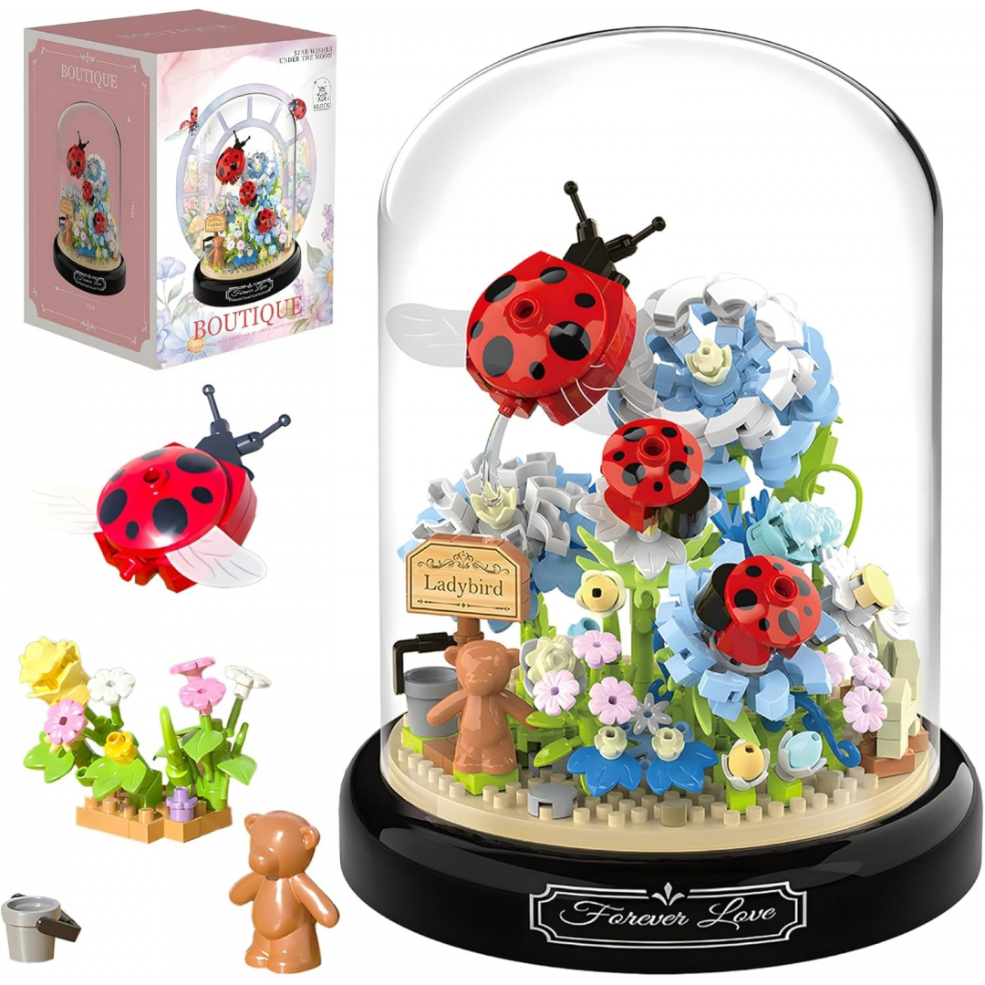 Декоративный конструктор в виде цветочной композиции с божьими коровками, размещённой под прозрачным куполом. Модель собирается из 596 деталей и после сборки представляет собой интерьерный элемент, подходящий для оформления полки, стола или витрины.