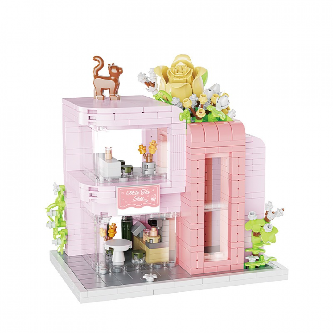 Декоративный конструктор в виде двухэтажного чайного домика, оформленного в нежных пастельных тонах с цветочными элементами. После сборки модель представляет собой интерьерную мини-постройку с проработанными деталями фасада и внутреннего пространства.