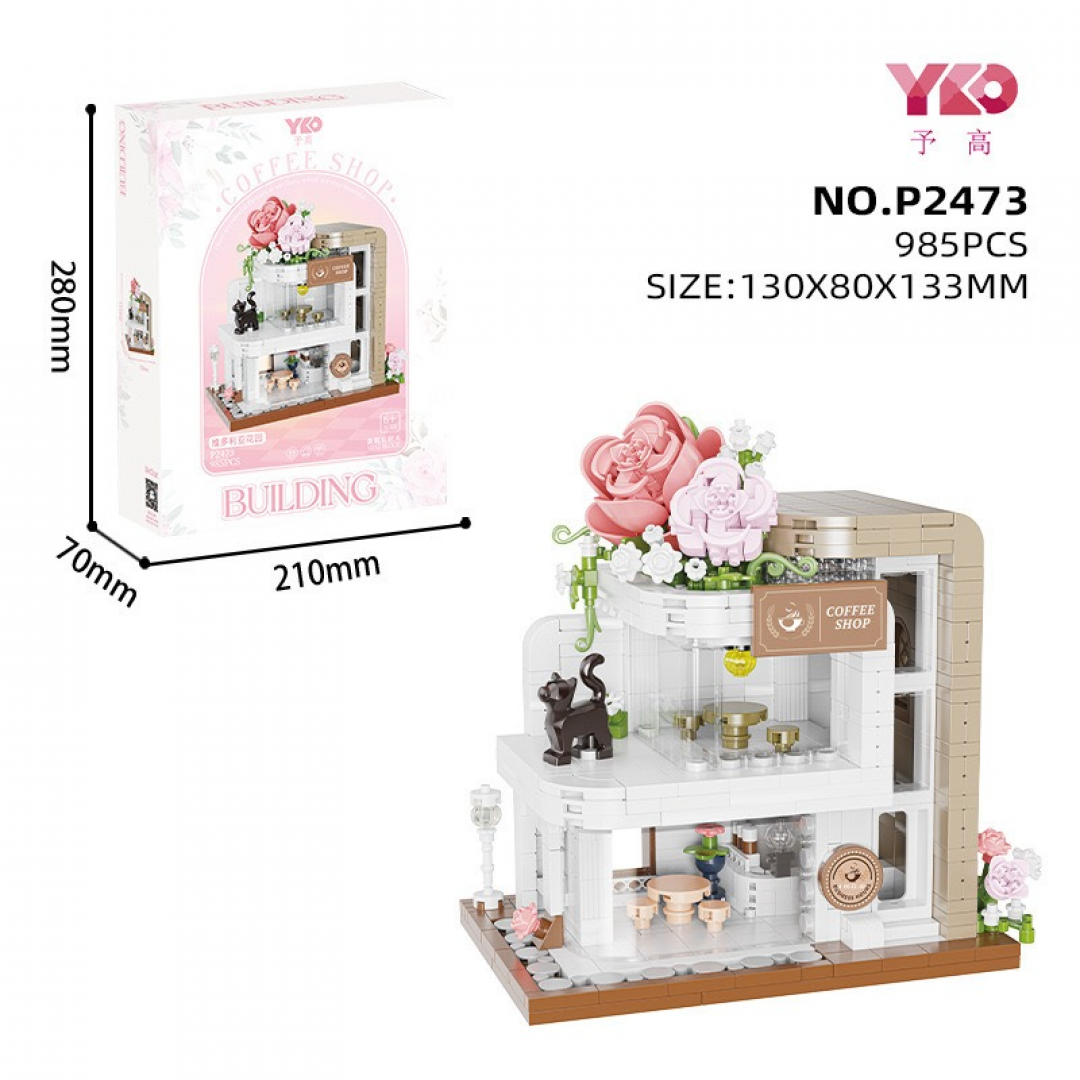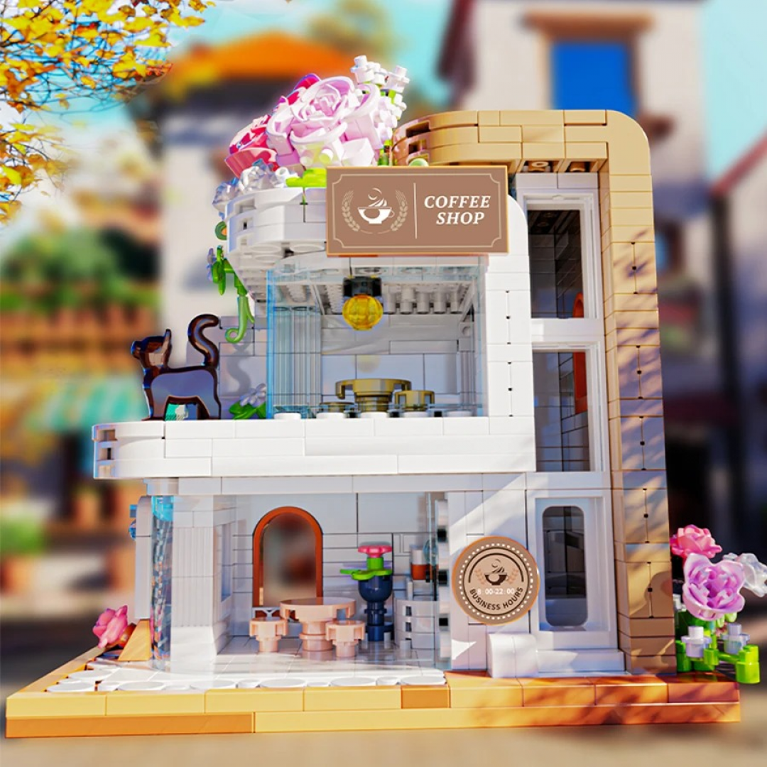 Декоративный конструктор в виде двухэтажного здания с кофейней и цветочным оформлением. Модель выполнена в светлых тонах с витражными элементами, вывеской Coffee Shop и детализированным интерьером. Подходит для сборки и последующего использования в качестве интерьерной композиции.