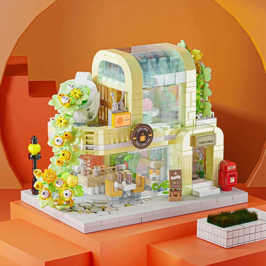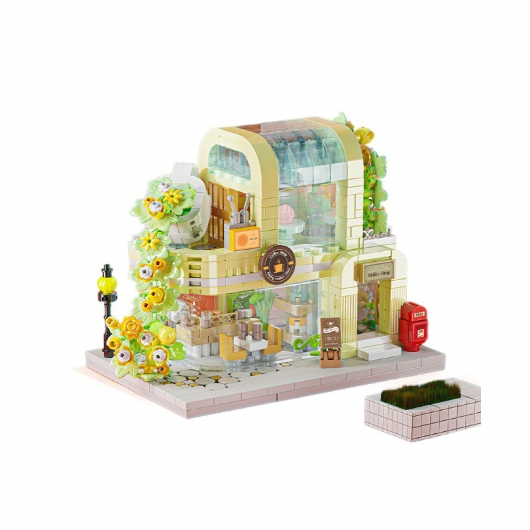 Декоративный конструктор в виде уютного городского здания с цветочным оформлением фасада и витрин. Модель выполнена в пастельной цветовой гамме и предназначена для сборки детализированной сценки с элементами уличного кафе и озеленения. После сборки конструкция подходит для интерьерного размещения.