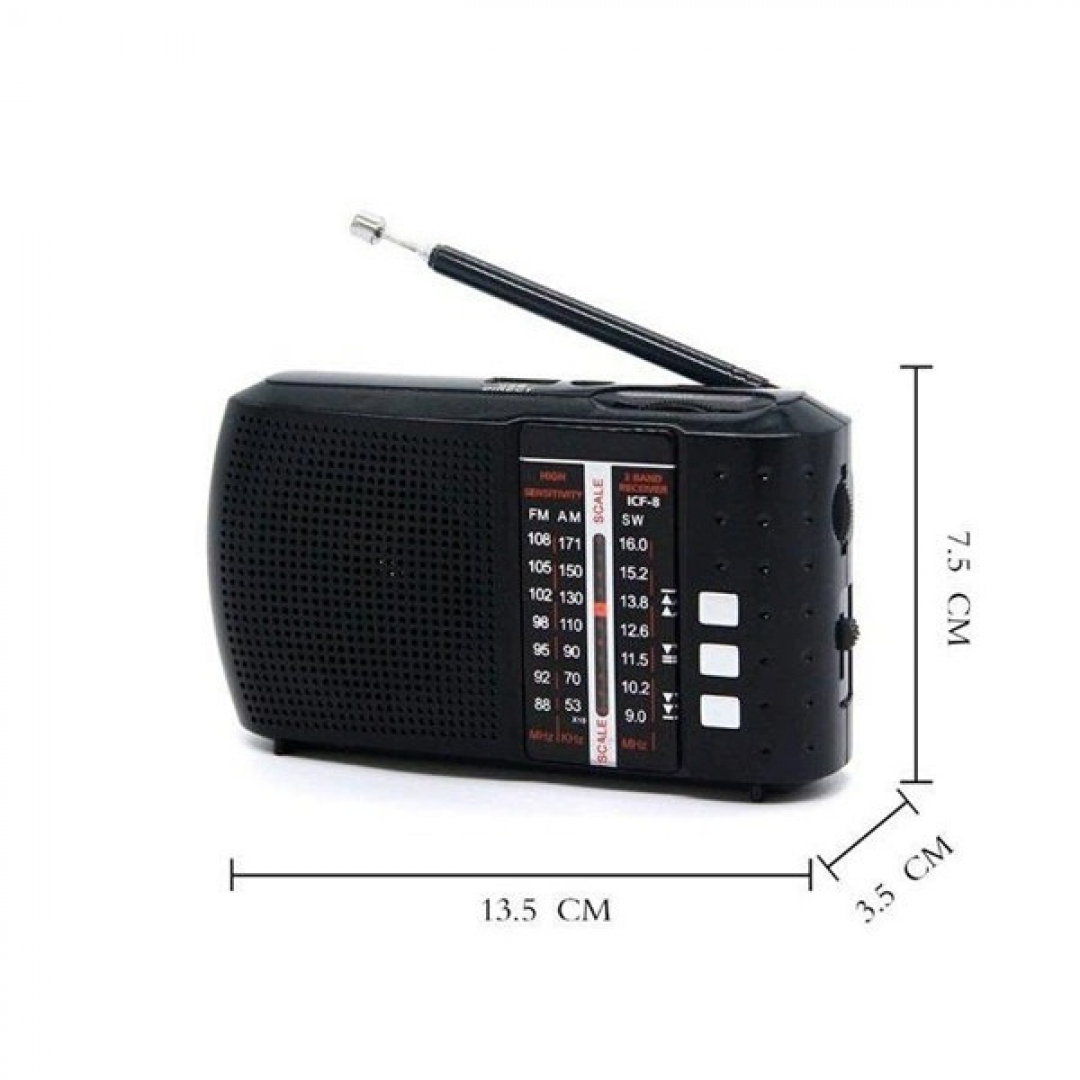 Портативный радиоприемник Golon ICF-8 предназначен для приема радиостанций в диапазонах AM, FM и SW, а также для воспроизведения MP3-аудиофайлов с USB-накопителей и карт памяти TF. Оснащен телескопической антенной и аналоговой настройкой частоты, что обеспечивает стабильный прием сигнала. Подходит для использования дома и в дороге.