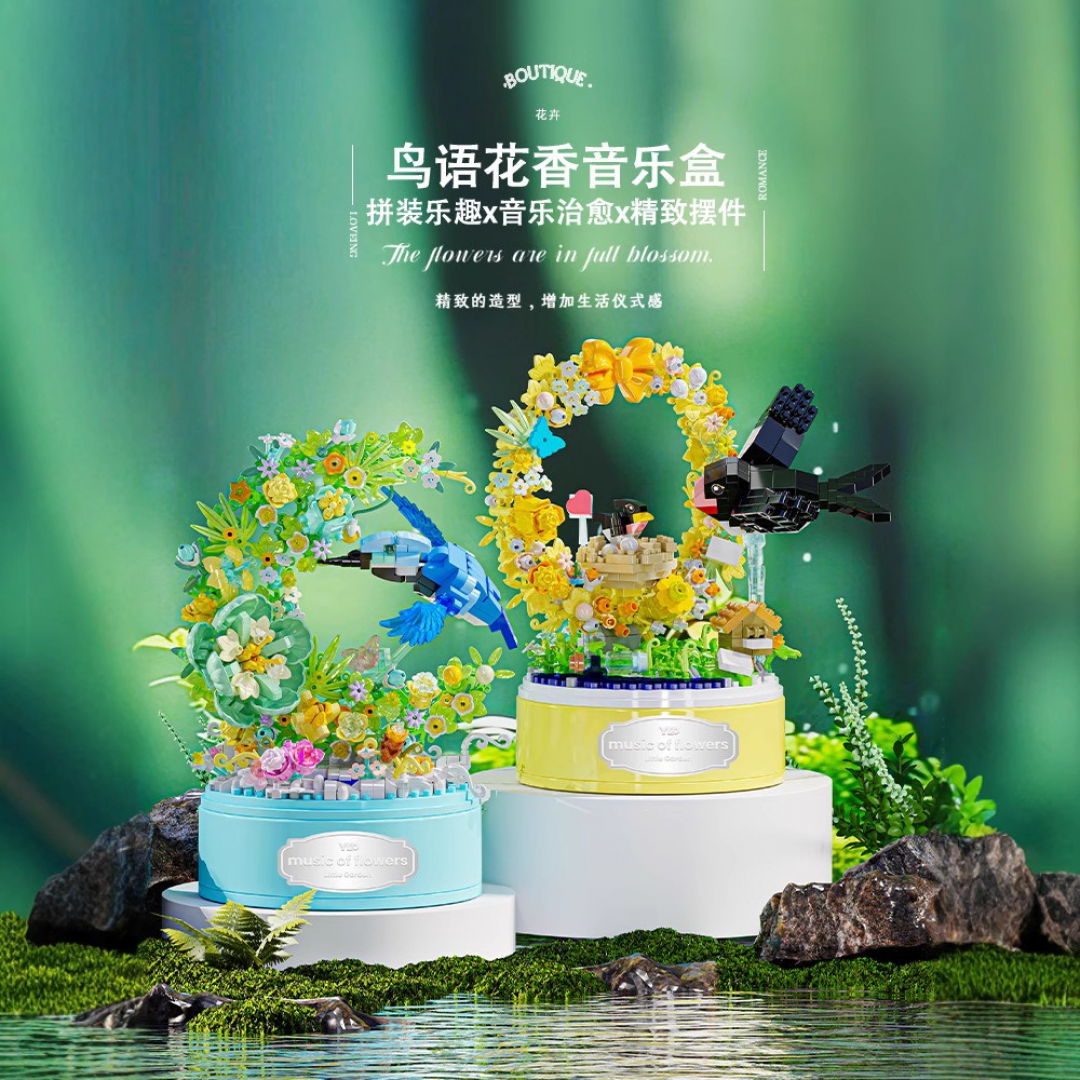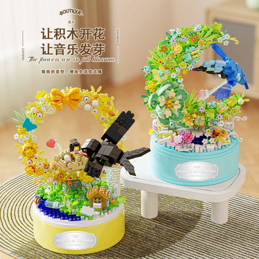Декоративный конструктор в виде изящной композиции с колибри и цветами на круглой подставке. После сборки модель представляет собой детализированное интерьерное украшение, подходящее для дома, офиса или витрины.