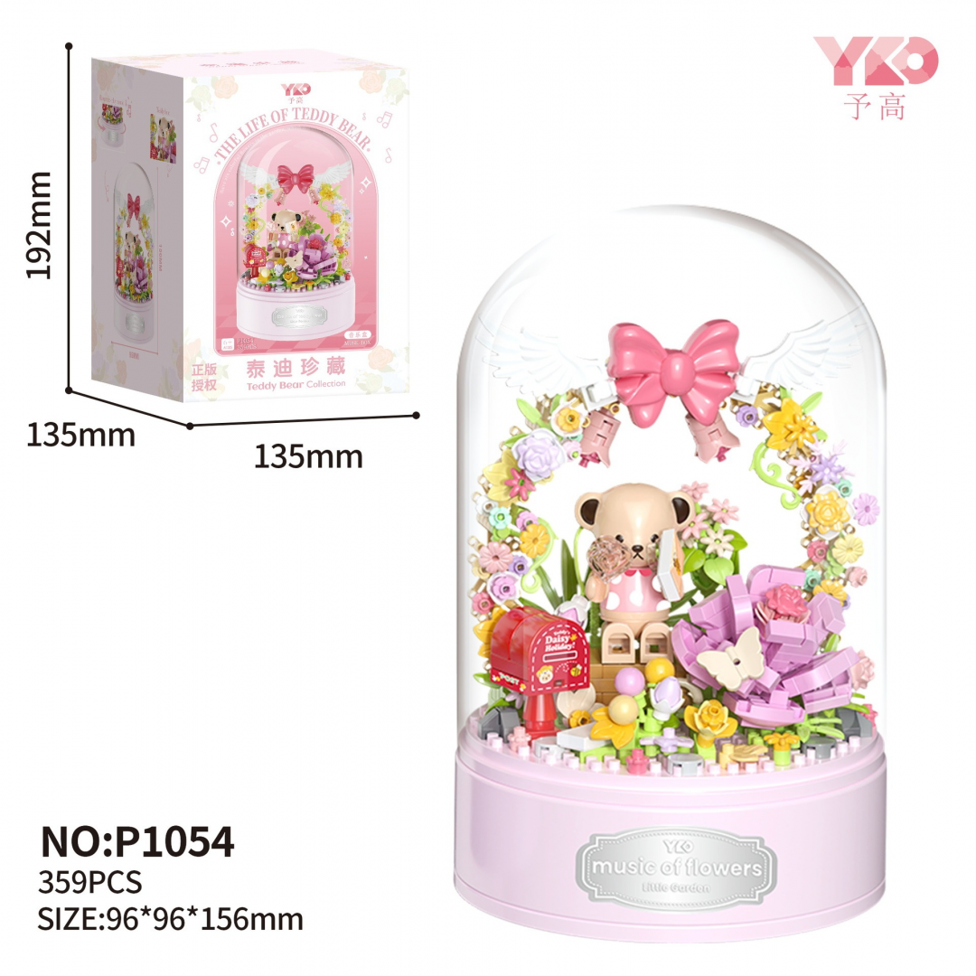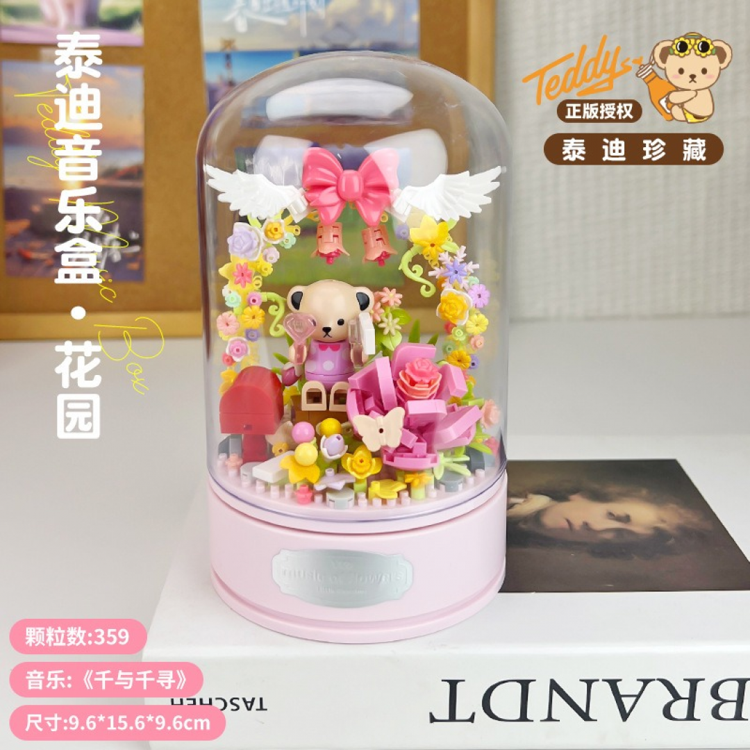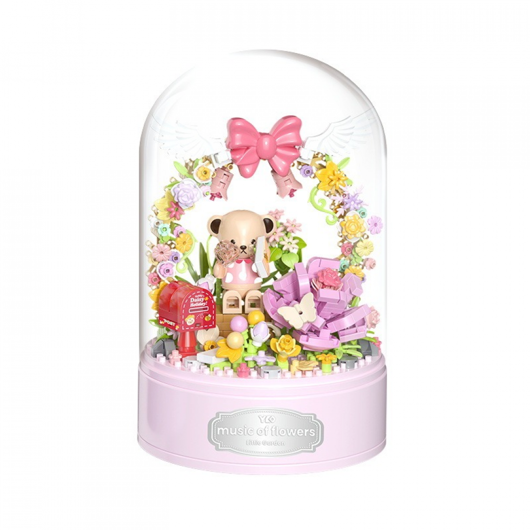 Собранная композиция представляет собой фигурку медвежонка, окружённого цветами, декоративными элементами и аркой с бантом. Конструкция размещена на круглой основе и закрыта прозрачным колпаком, который защищает модель от пыли и придаёт завершённый вид. Детали плотно соединяются между собой, обеспечивая устойчивость готовой модели. Конструктор подходит для спокойной, сосредоточенной сборки и оформления полки, стола или витрины.