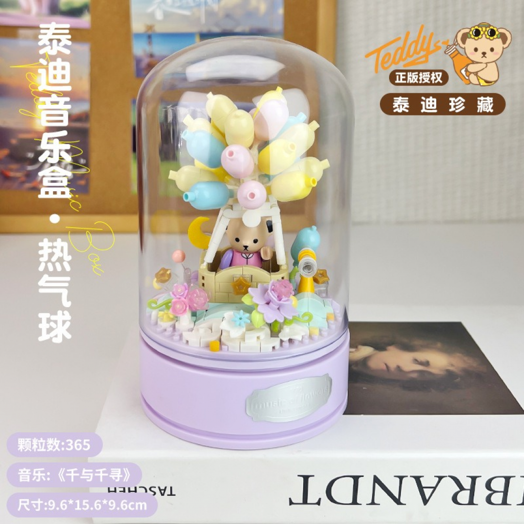 Декоративный конструктор в виде сценки с медвежонком в корзине и связкой воздушных шаров, размещённой под прозрачным куполом. Композиция выполнена в пастельных тонах и предназначена для сборки и последующего интерьерного размещения.