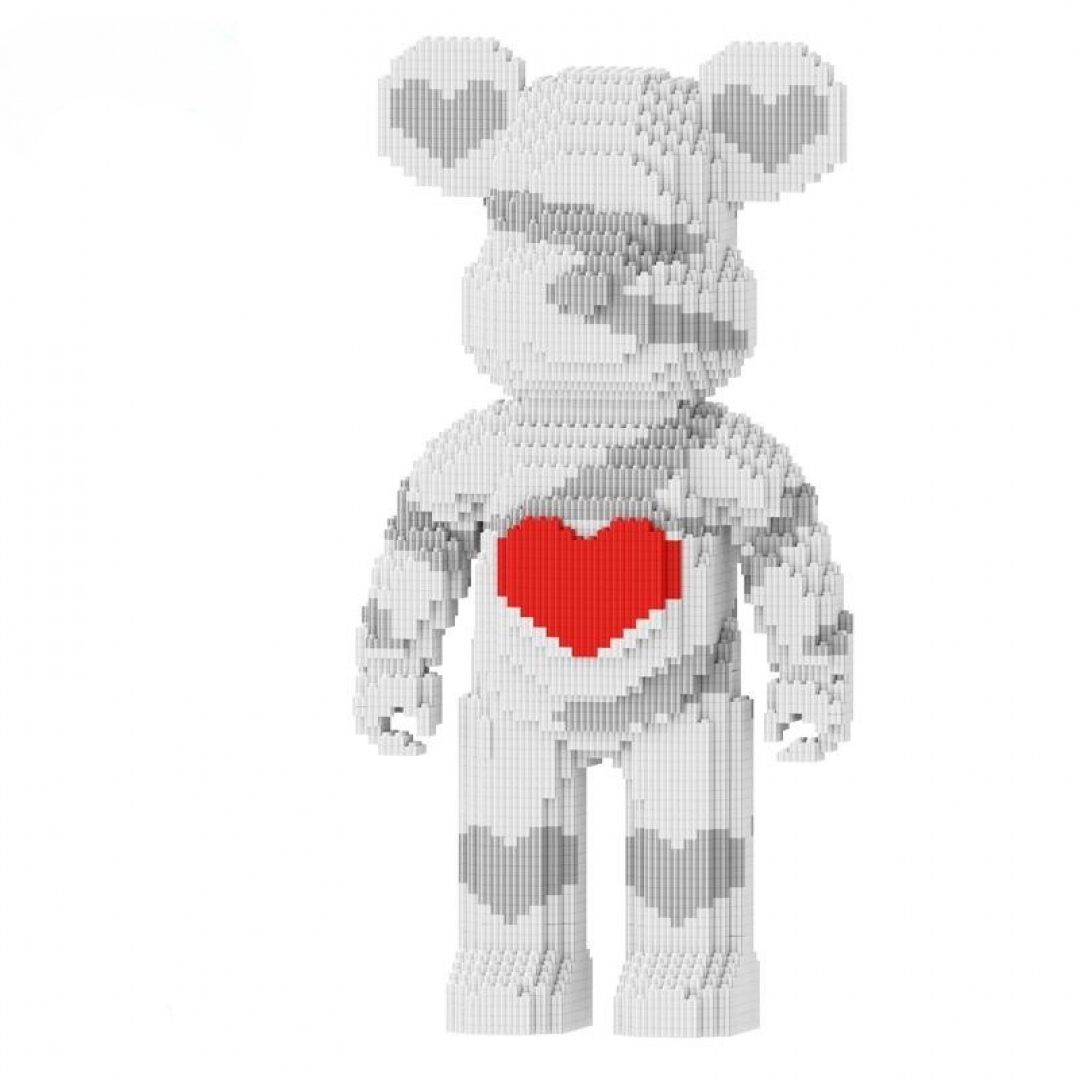 Конструктор представляет собой сборную фигурку в стиле Bearbrick, выполненную из мелких строительных блоков. Модель предназначена для поэтапной сборки и формирует объёмную фигуру с минималистичным дизайном и декоративным элементом в виде сердца на корпусе.