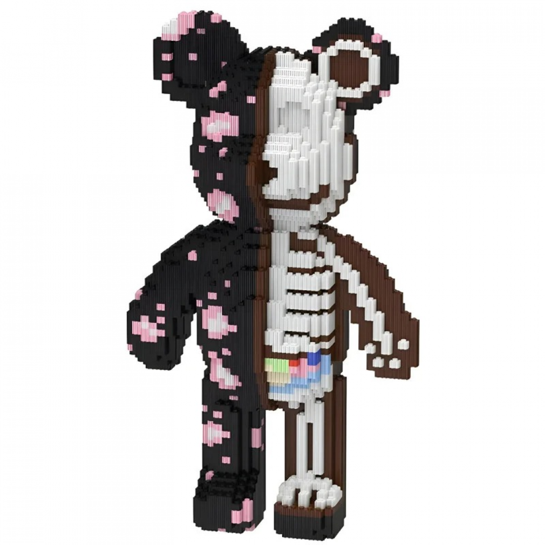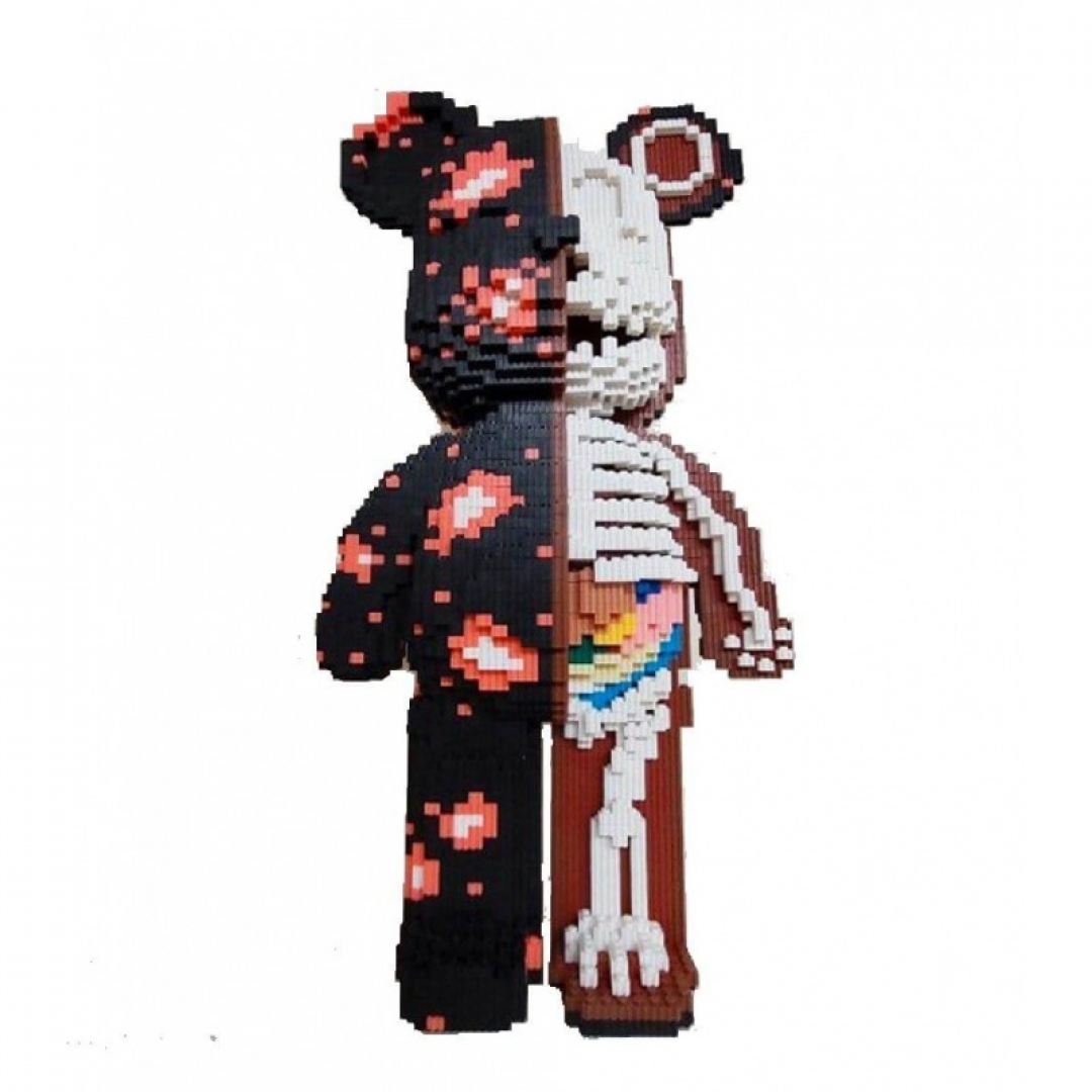 Конструктор представляет собой сборную фигурку в стиле Bearbrick, выполненную из мелких строительных блоков. Модель выполнена в формате «skeleton» с визуальным разделением на внешнюю часть и внутреннюю анатомическую структуру, что подчёркивает декоративный и коллекционный характер изделия.