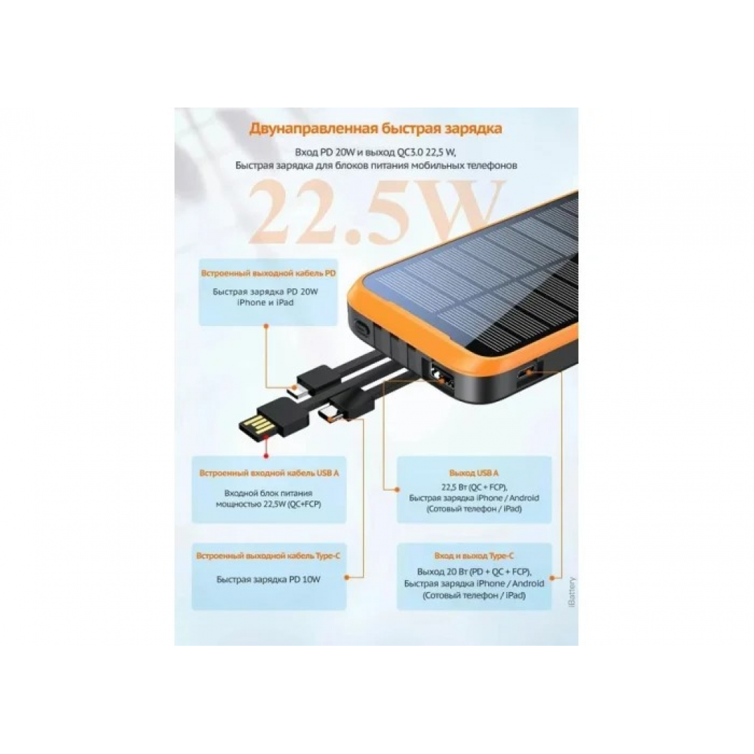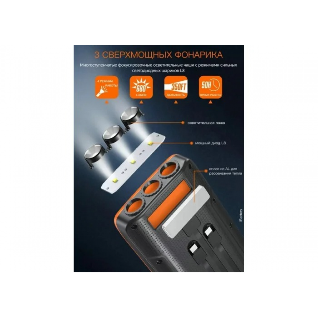 Устройство имеет три встроенных кабеля (USB-A, Type-C и кабель с разъёмом PD), а также порты USB и Type-C для подключения внешних устройств. Поддерживает быструю зарядку до 22,5 Вт и беспроводную зарядку. В корпус встроены три светодиодных фонаря с различными режимами работы.