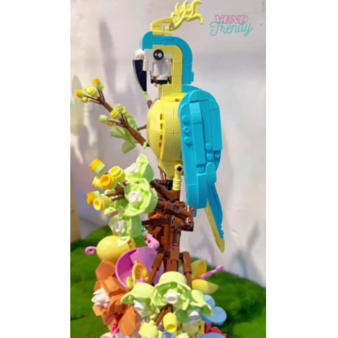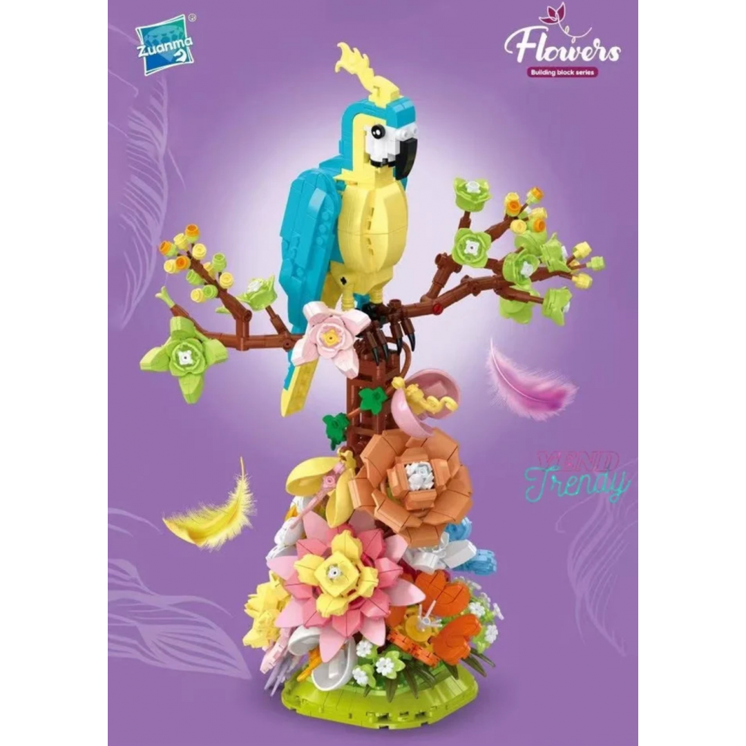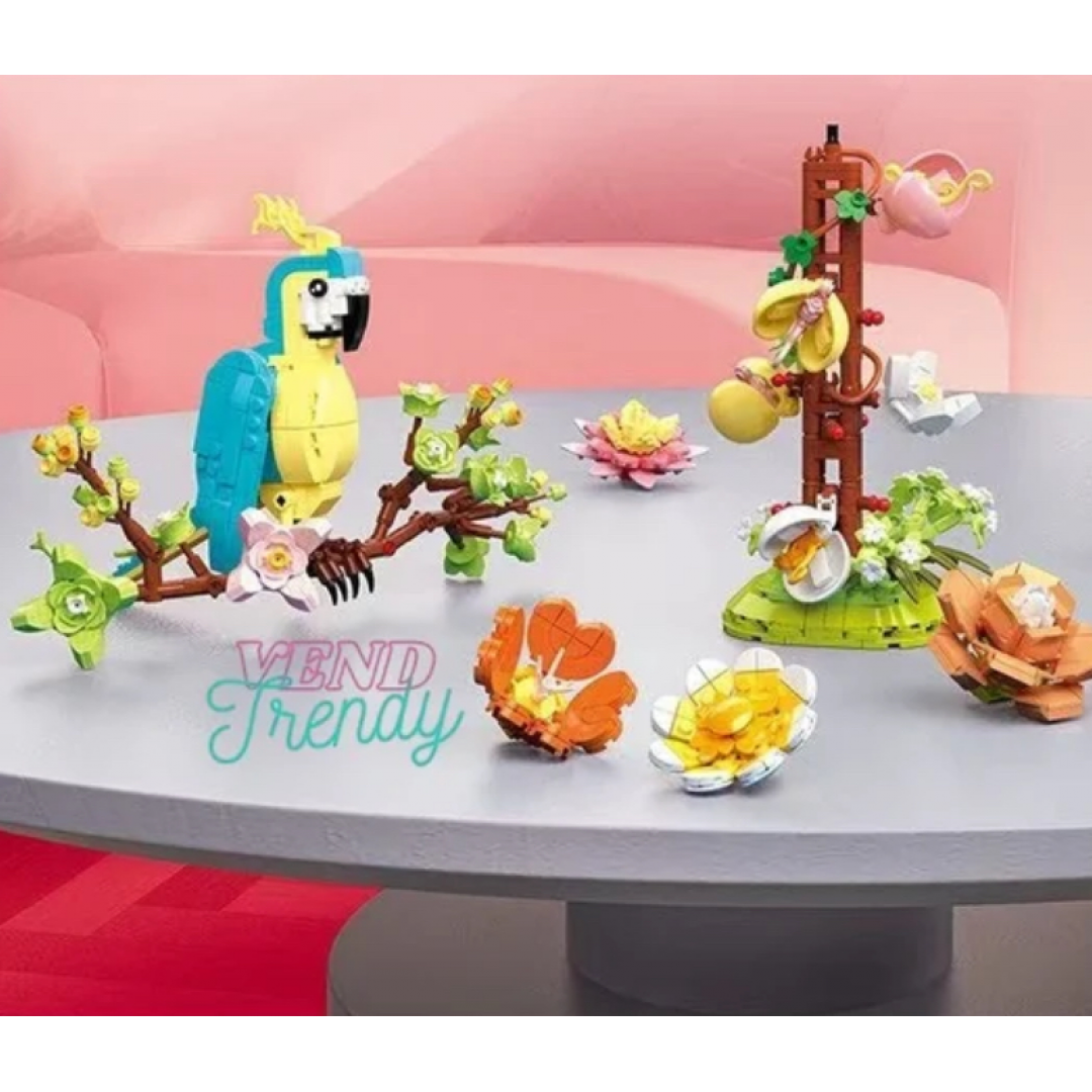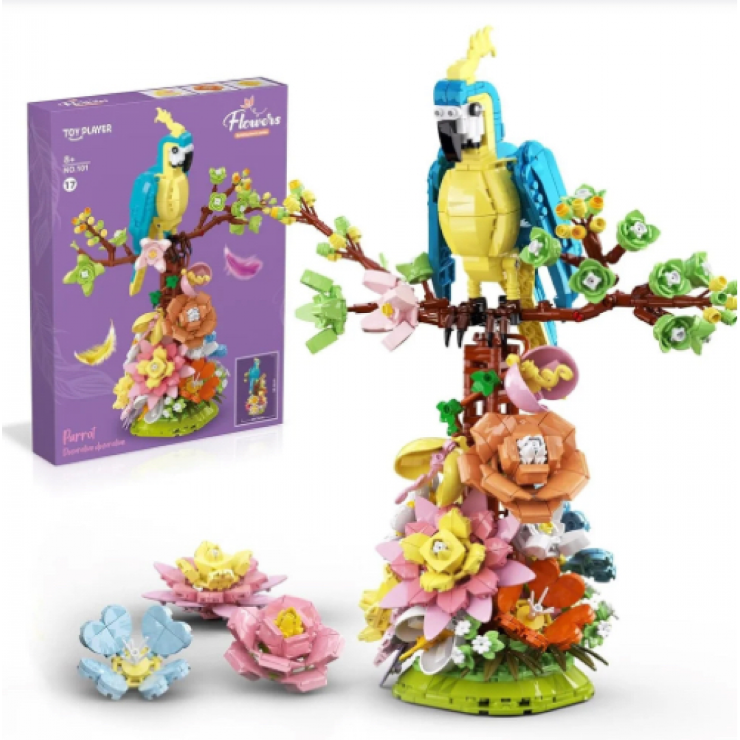 • Фигурка попугая, цветочные элементы и суккуленты для сборки модели.