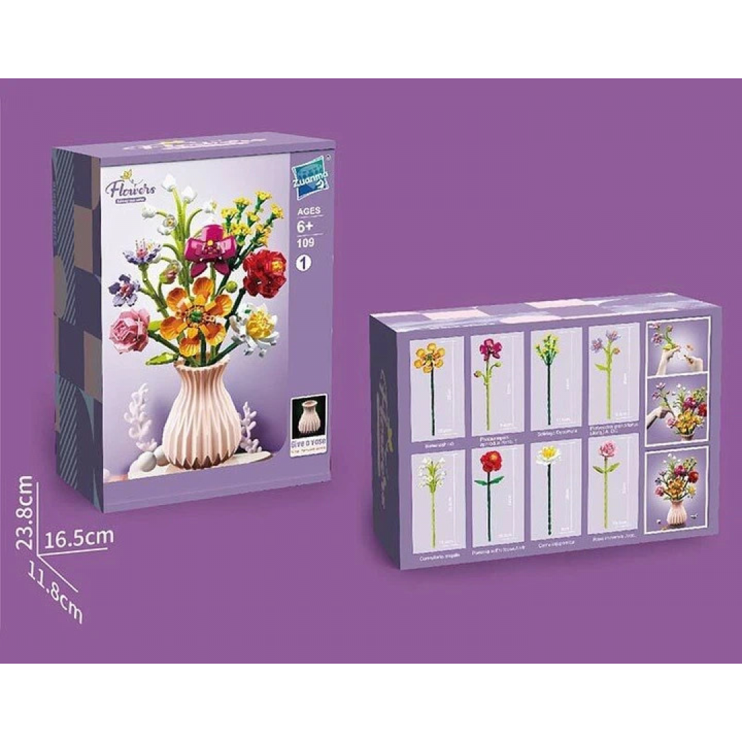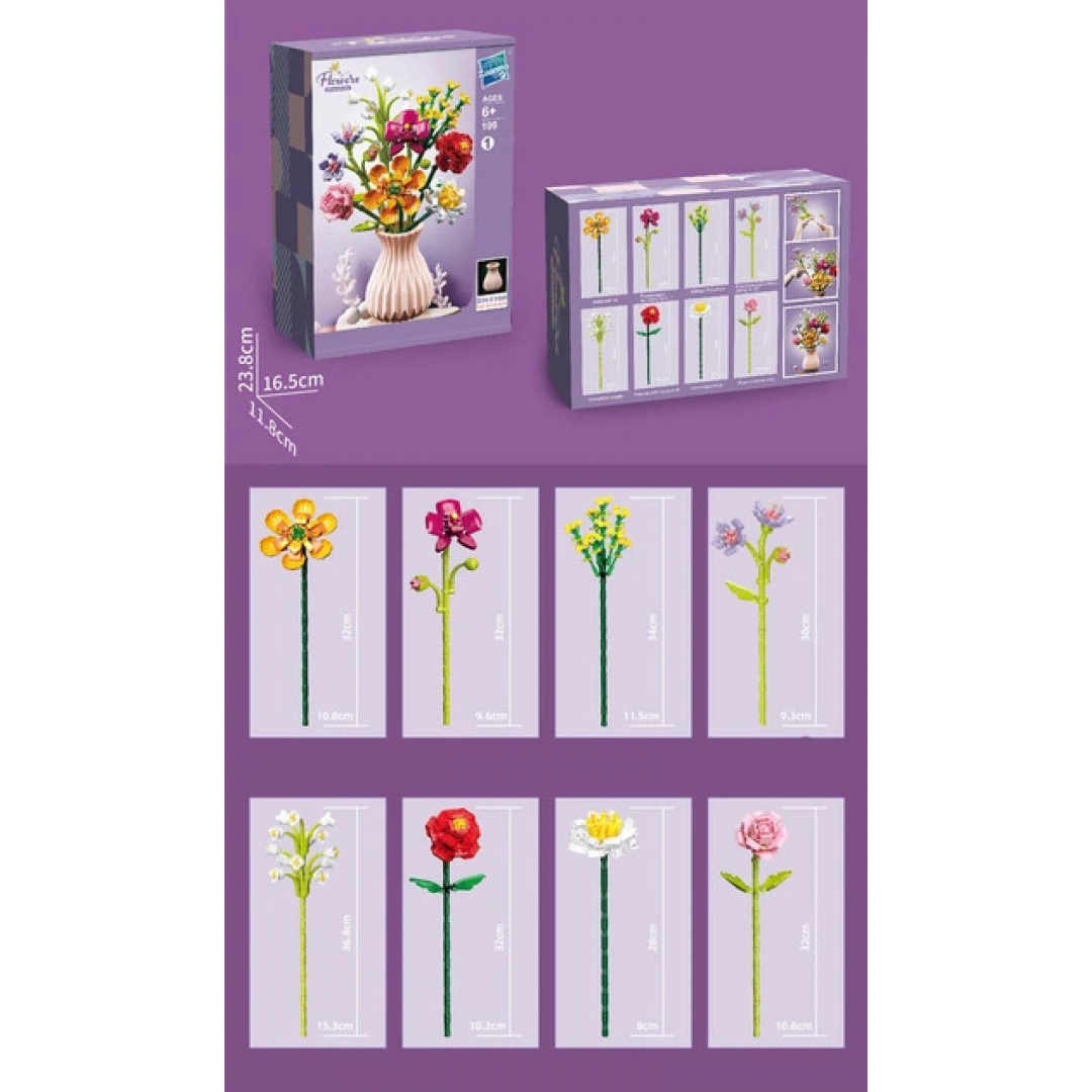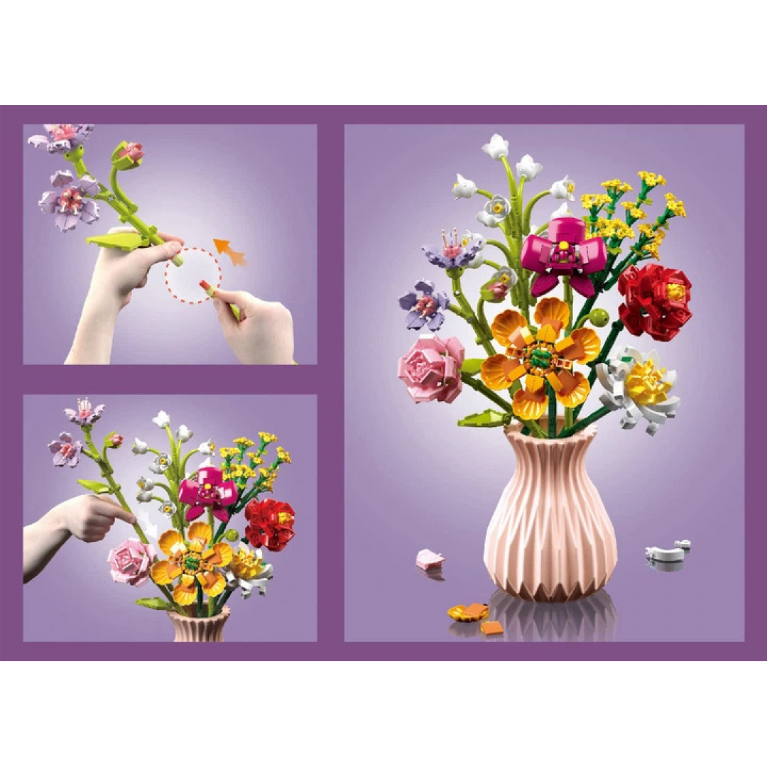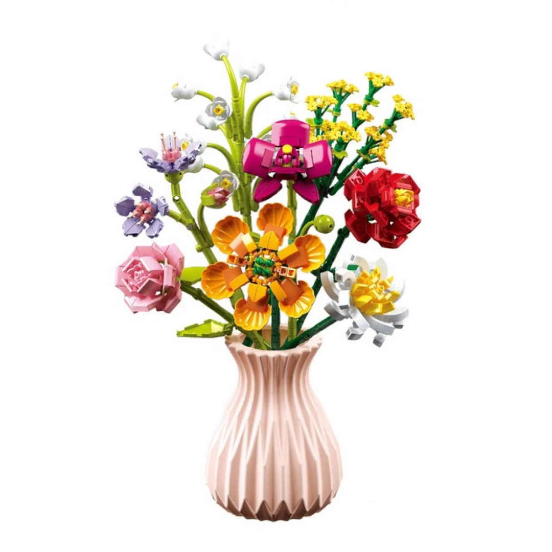 Конструктор «Букет в розовой вазе» представляет собой набор из 756 пластиковых элементов для сборки объёмной композиции в виде букета цветов в вазе. Элементы соединяются между собой методом пазового крепления, формируя устойчивую и декоративную модель.