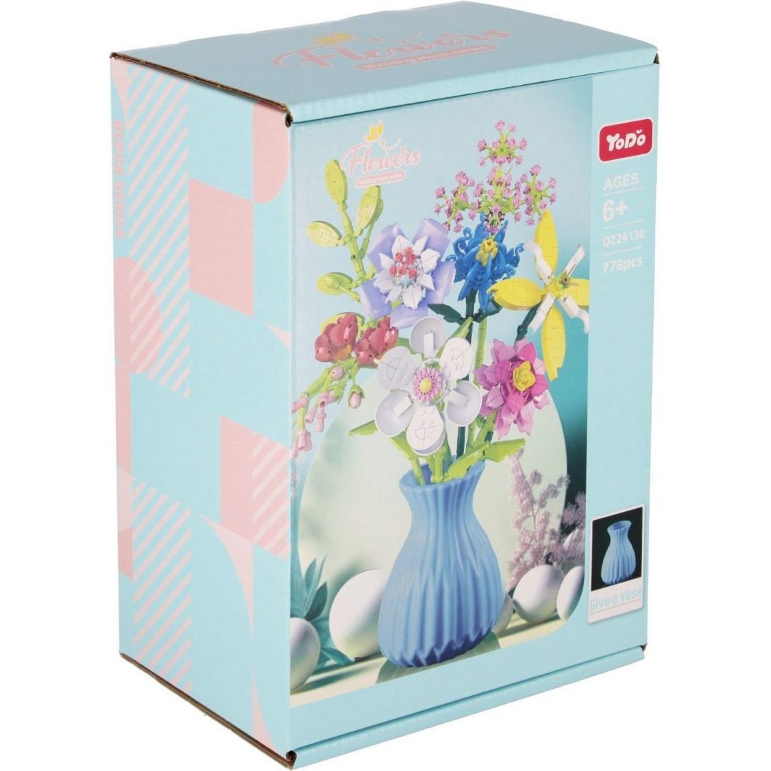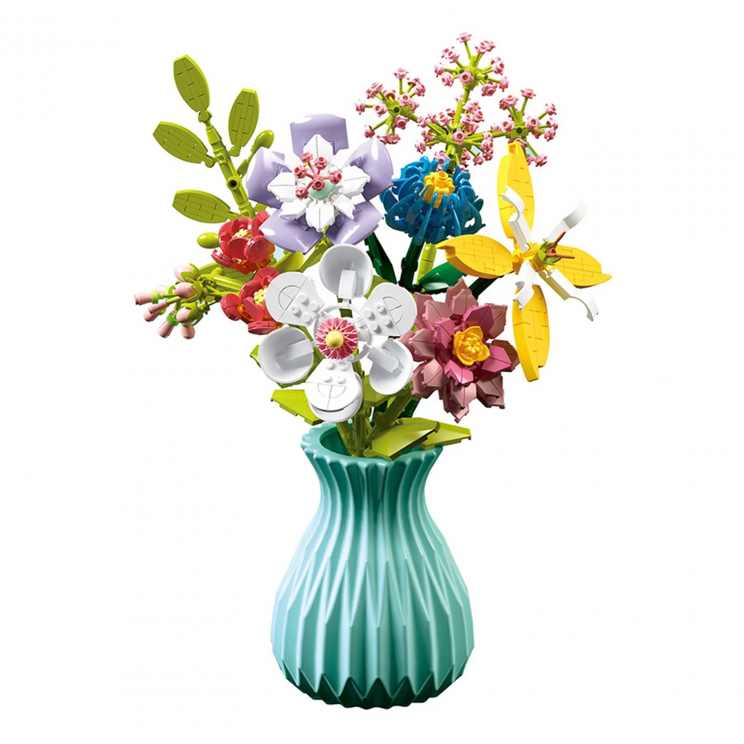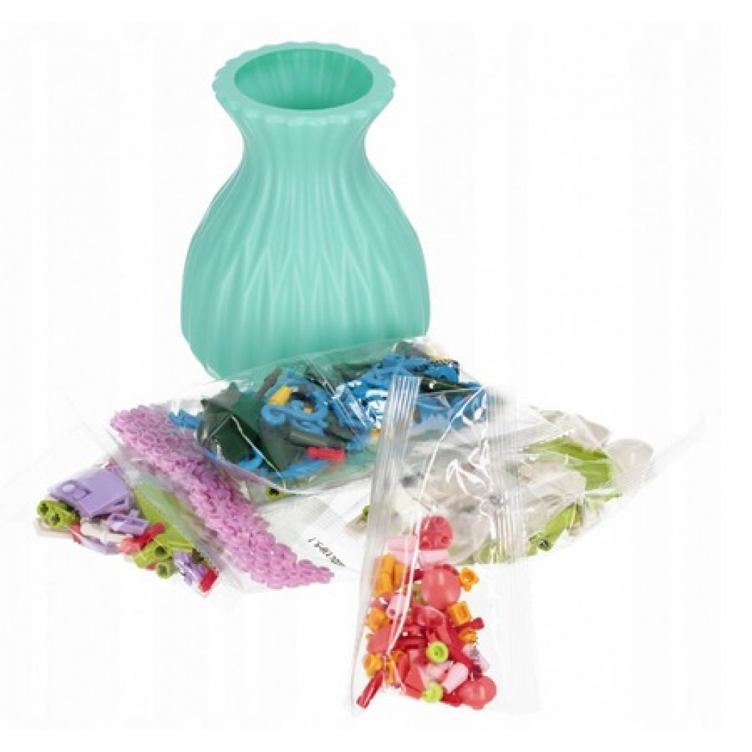 Конструктор «Букет в бирюзовой вазе» представляет собой набор из 792 пластиковых элементов, предназначенных для сборки объёмной композиции в виде цветов. Элементы изготовлены из безопасного пластика и соединяются между собой, формируя устойчивые цветочные модели, которые могут использоваться как декоративный объект после сборки.