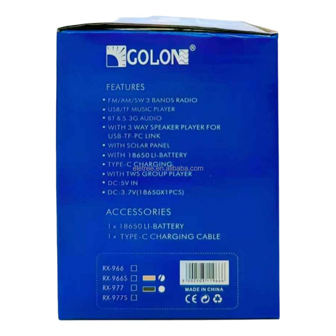 Радиоприемник Golon RX-966, FM/AM/SW, Bluetooth, USB, TF, солнечная панель, съемный аккумулятор 18650