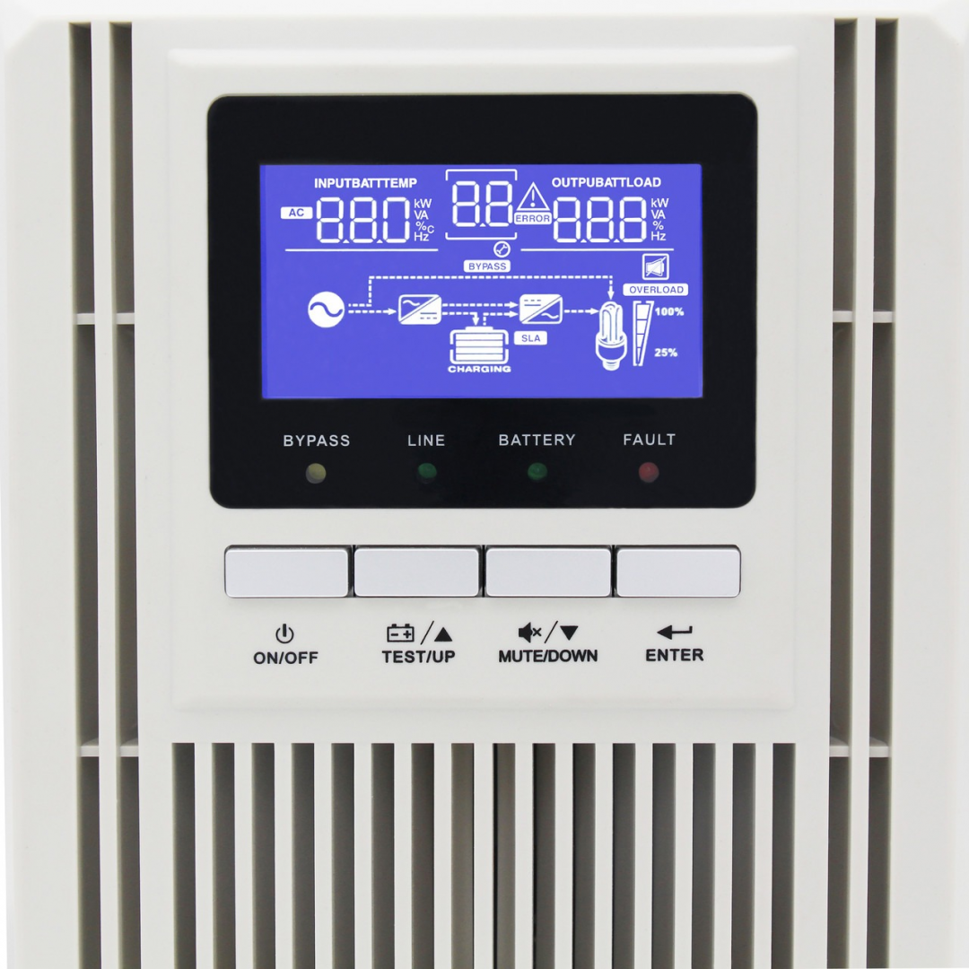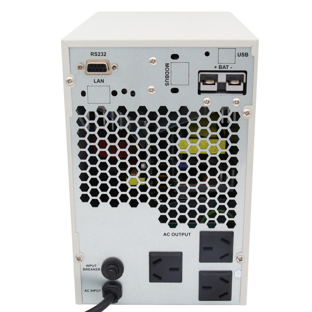 Модель работает от сети переменного тока 220 В и поддерживает подключение внешних аккумуляторов напряжением 36 В DC. Оснащена цифровым дисплеем, кнопками управления и интерфейсом RS232 для мониторинга через компьютер. Предусмотрены три режима работы: от сети, от аккумуляторной батареи и режим байпаса.