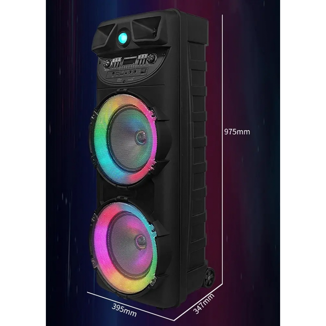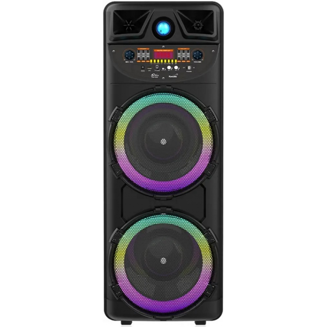Колонка оборудована FM-радио, входом AUX и светодиодной RGB-подсветкой динамиков. В комплект входит беспроводной микрофон и пульт дистанционного управления. Конструкция предусматривает встроенную ручку для переноски и колёса для транспортировки.