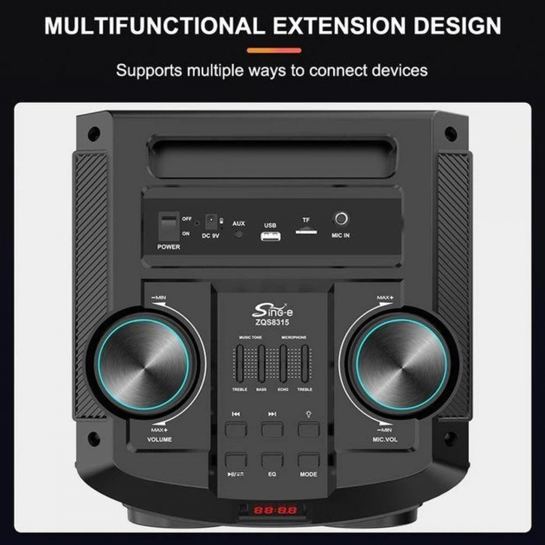 Портативная акустическая система ZQS8315 предназначена для воспроизведения музыки и проведения мероприятий. Модель оснащена тремя динамиками мощностью по 40 Вт каждый, суммарная мощность составляет 120 Вт. Поддерживается подключение по Bluetooth, а также воспроизведение аудиофайлов с USB-накопителей и карт памяти SD.