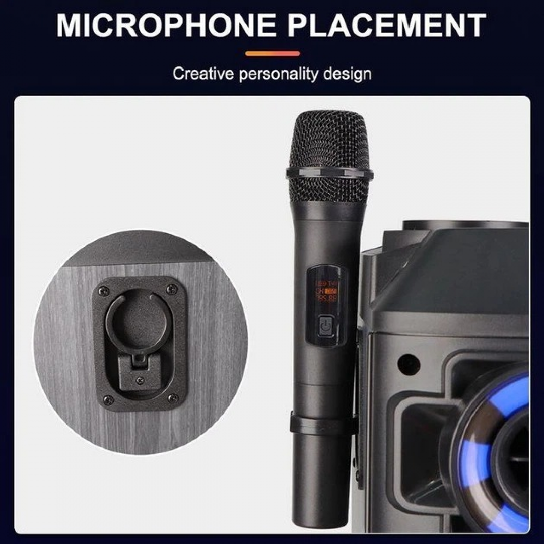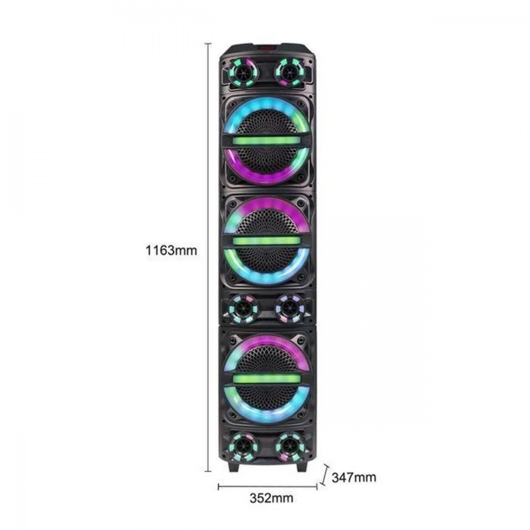 Колонка оборудована FM-радио, входом AUX и встроенной светомузыкой. В комплект входят два беспроводных микрофона и пульт дистанционного управления. Конструкция предусматривает выдвижную ручку и колёса для удобной транспортировки. Питание осуществляется от встроенного аккумулятора.