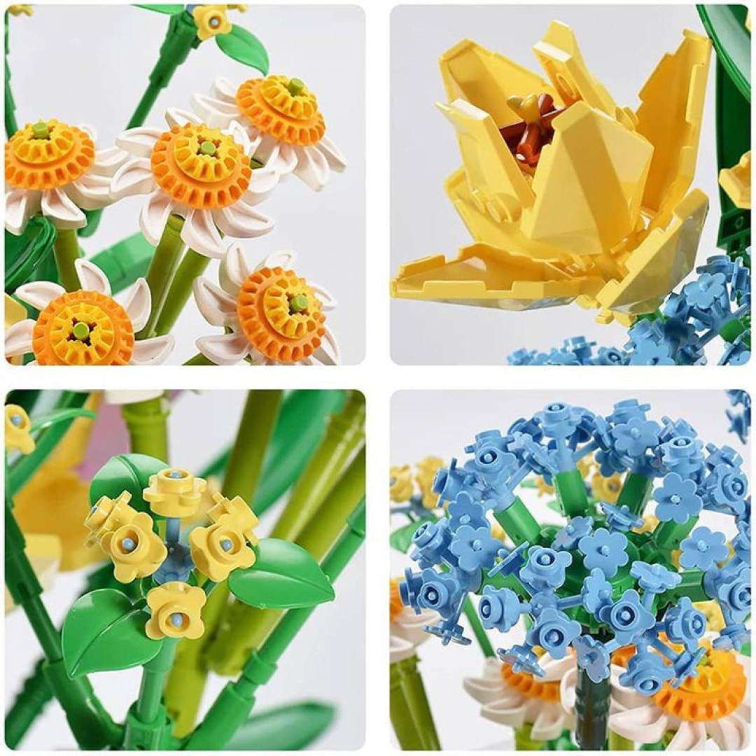 Детский 3D‑конструктор представляет собой набор пластиковых блоков для сборки цветочной композиции в виде букета тюльпанов с дополнительными элементами растений. Набор состоит из 837 деталей и включает инструкцию по сборке. Сборка способствует развитию творческого мышления, мелкой моторики и внимания у ребёнка, а готовая композиция может быть использована как декоративный элемент.