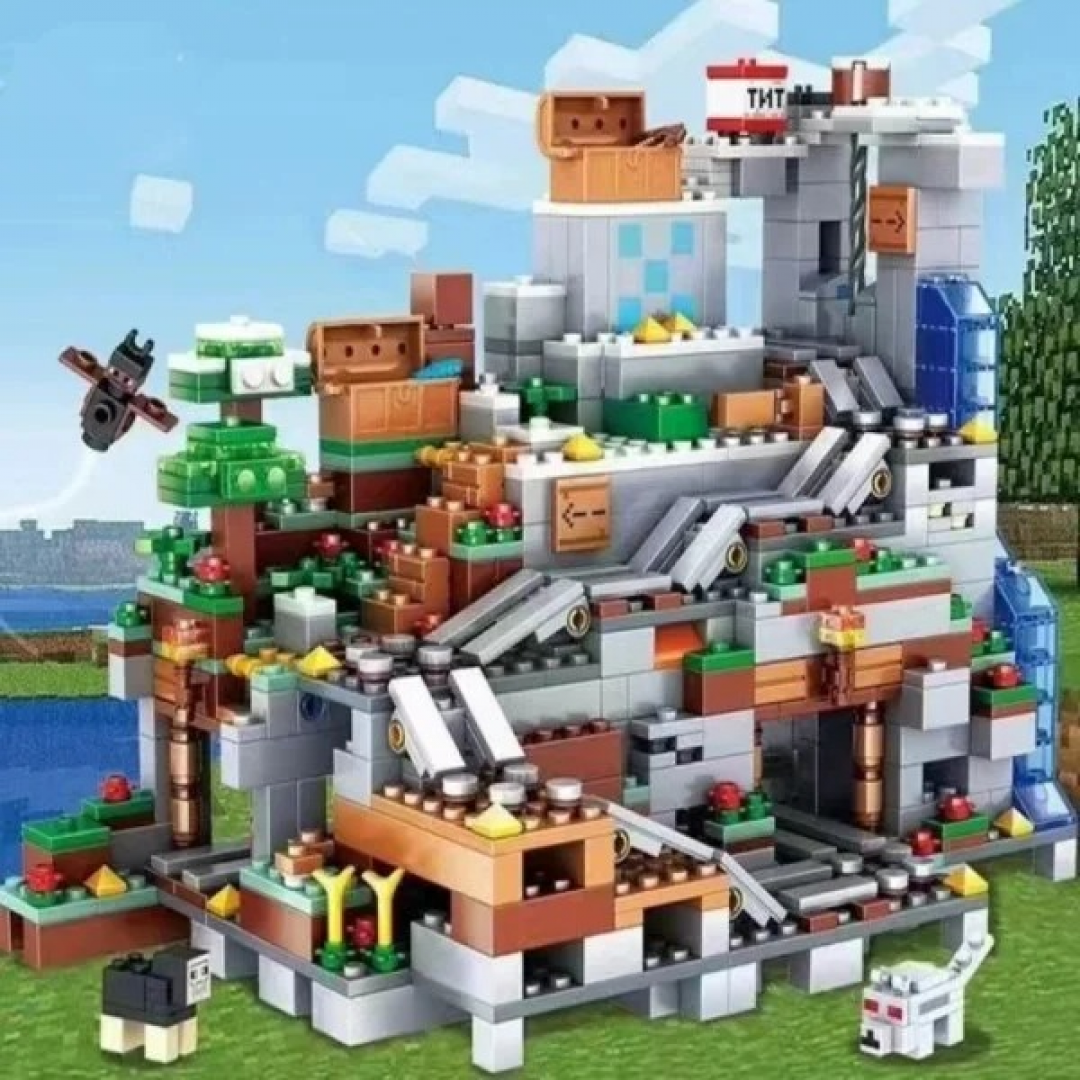 Детский конструктор тематически оформлен в стиле популярной игры «Minecraft» и представляет собой набор пластиковых блочных элементов для сборки многоуровневой структуры «Горная пещера» с различными локациями, механизмами и игровыми зонами. Набор включает 1089 деталей и цветную инструкцию по сборке. Конструкция позволяет создавать собственные сцены, взаимодействовать с мини‑фигурками персонажей и развивать навыки планирования, внимательности и мелкой моторики во время сборки и игры.