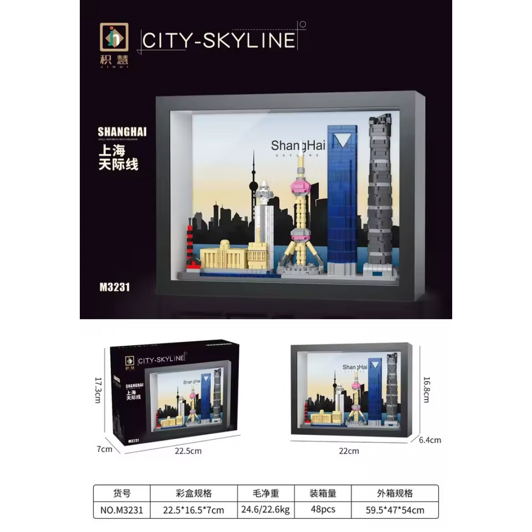 Декоративно‑тематический конструктор представляет собой набор пластиковых блочных элементов для сборки панорамной модели городского горизонта Шанхая с изображением архитектурных достопримечательностей и характерных городских объектов. Набор включает элементы для сборки и инструкцию. Сборка развивает творческое мышление, внимание и мелкую моторику, а готовая модель может использоваться как декоративный объект интерьера или часть коллекционной композиции.