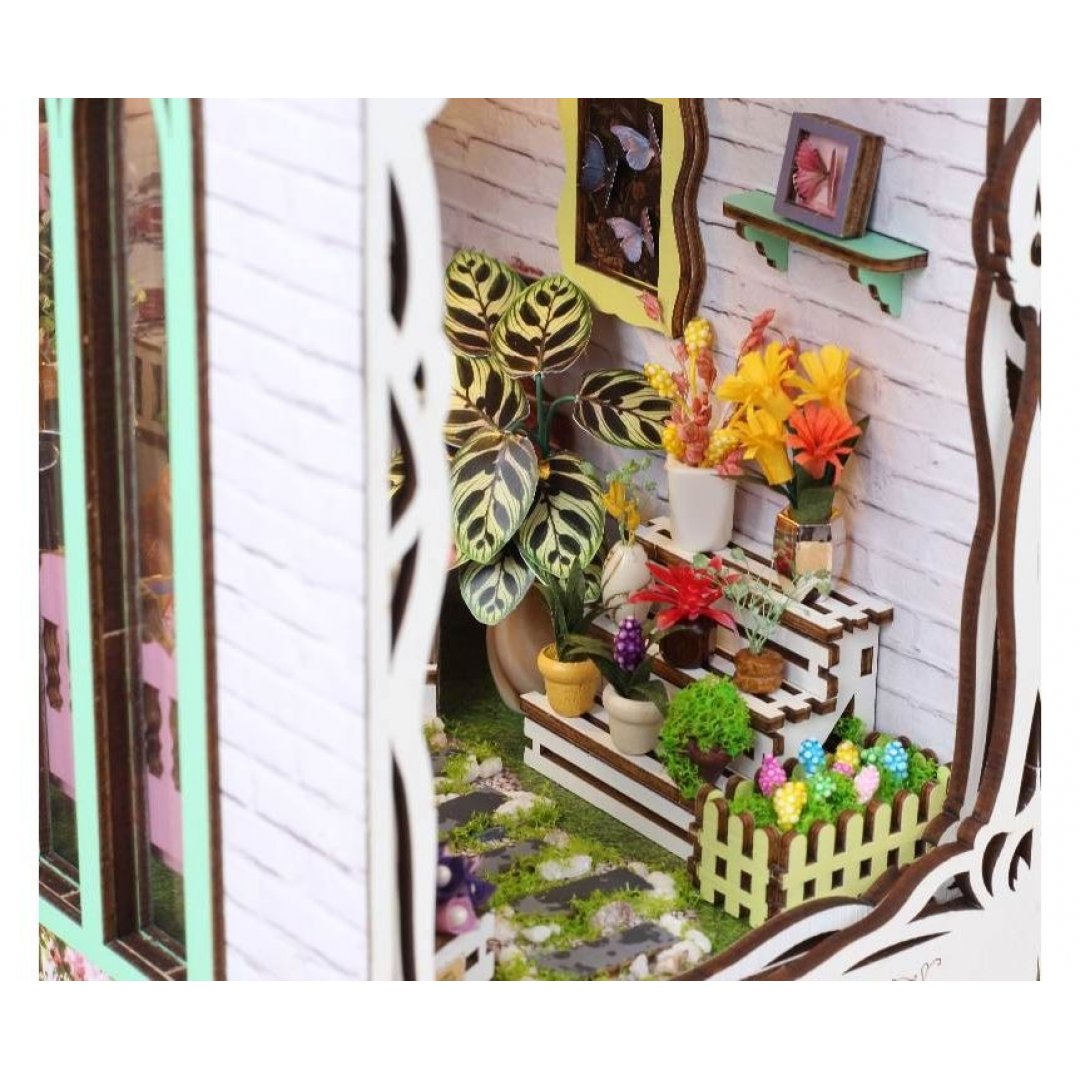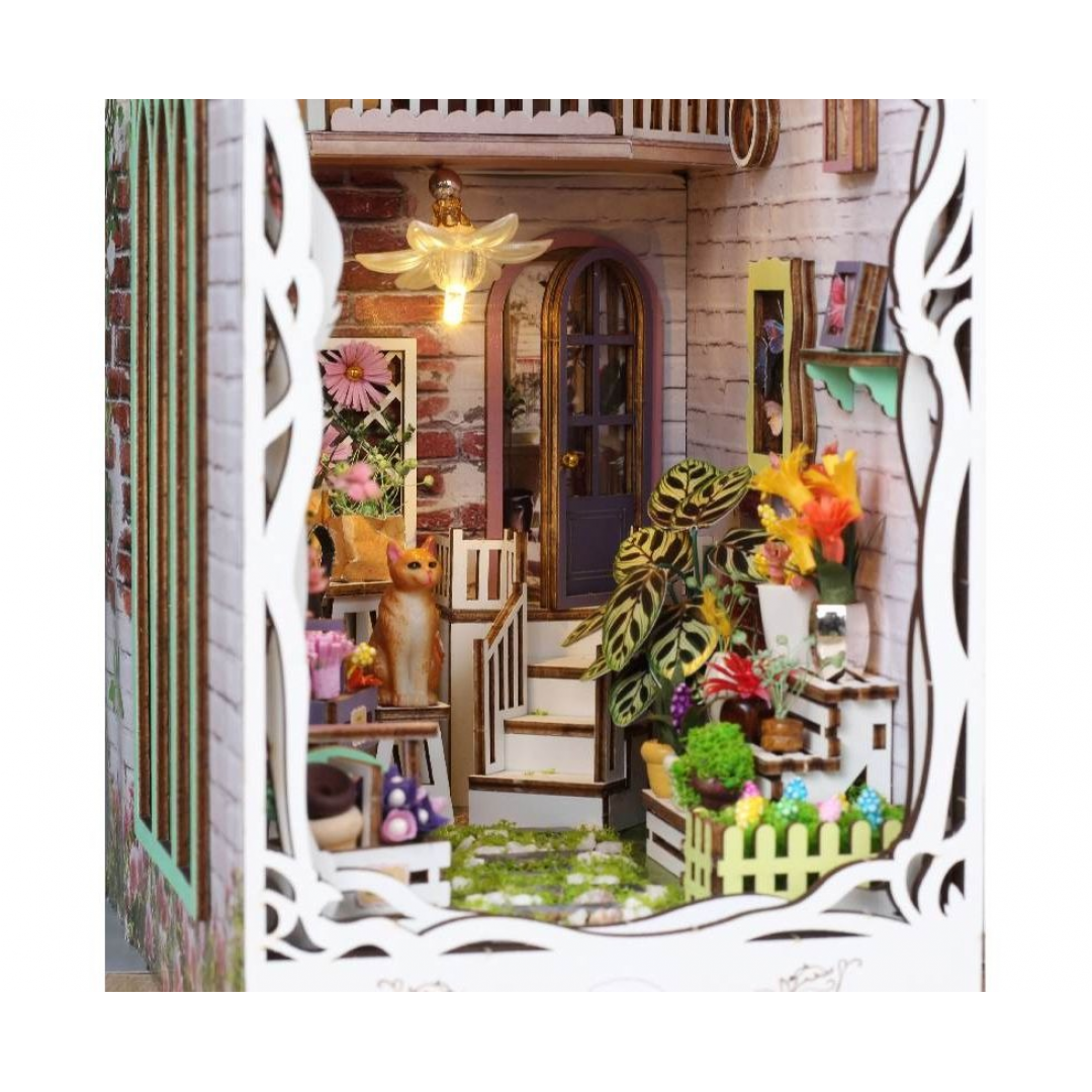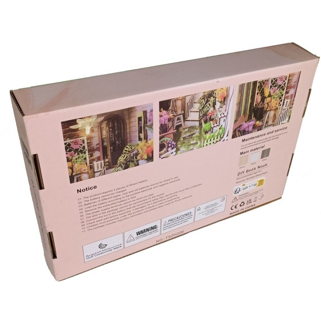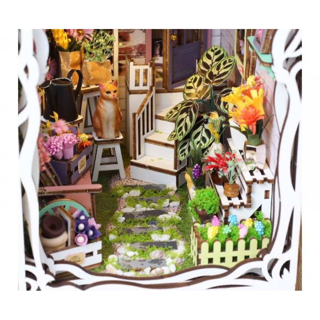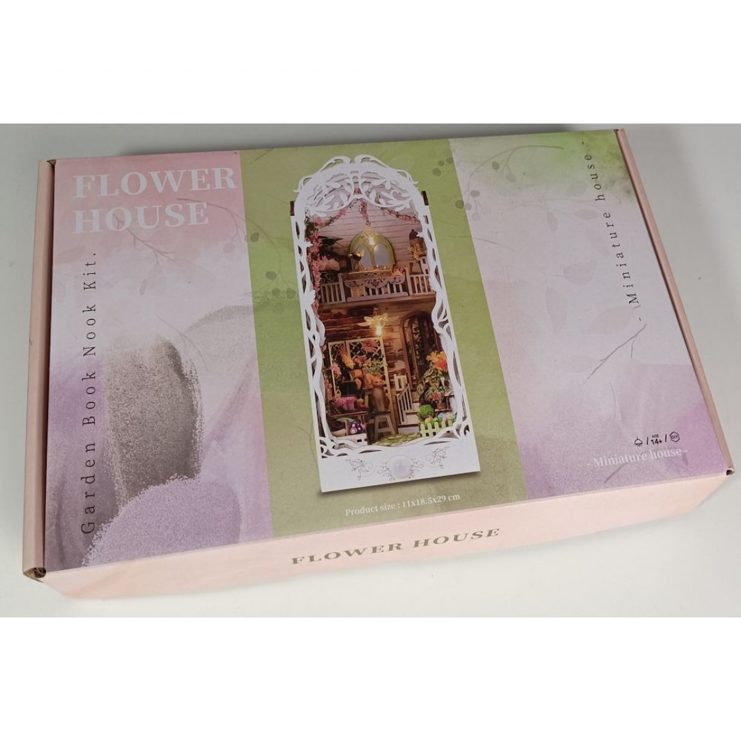 Декоративно‑тематический конструктор представляет собой набор деревянных и/или пластмассовых элементов для сборки трёхмерной мини‑диорамы — «Дом цветов» в стиле бук‑нунк (book nook). Готовый объект имеет размер 11×18×28 см и представляет собой интерьерную сцену, которую можно разместить между книг на полке или использовать как отдельный предмет декора. Сборка способствует развитию творческого мышления, усидчивости и мелкой моторики.