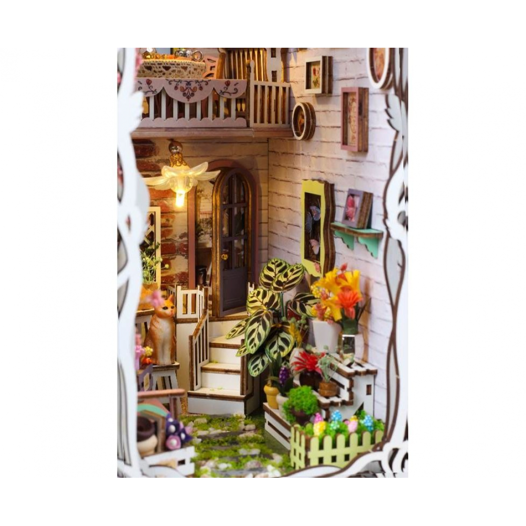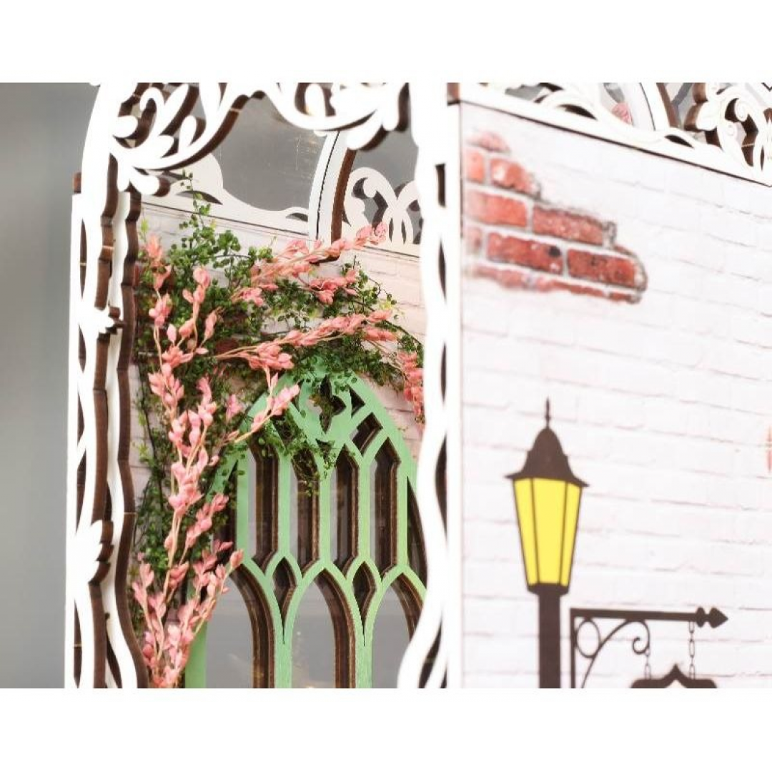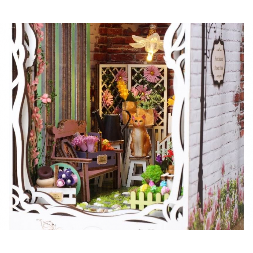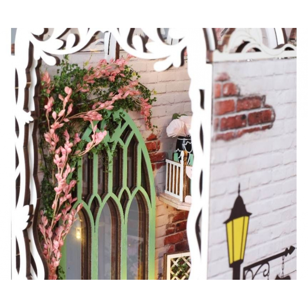 Декоративно‑тематический конструктор представляет собой набор деревянных и/или пластмассовых элементов для сборки трёхмерной мини‑диорамы — «Дом цветов» в стиле бук‑нунк (book nook). Готовый объект имеет размер 11×18×28 см и представляет собой интерьерную сцену, которую можно разместить между книг на полке или использовать как отдельный предмет декора. Сборка способствует развитию творческого мышления, усидчивости и мелкой моторики.