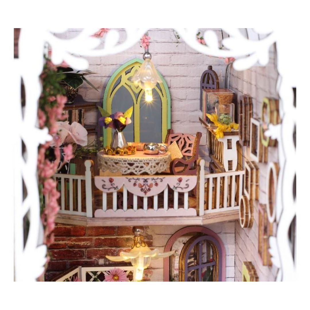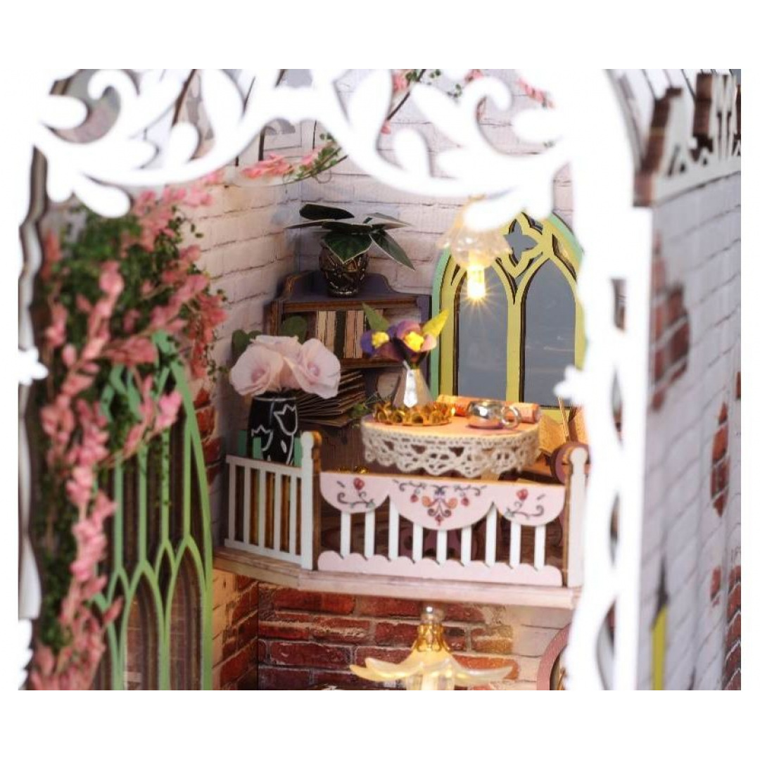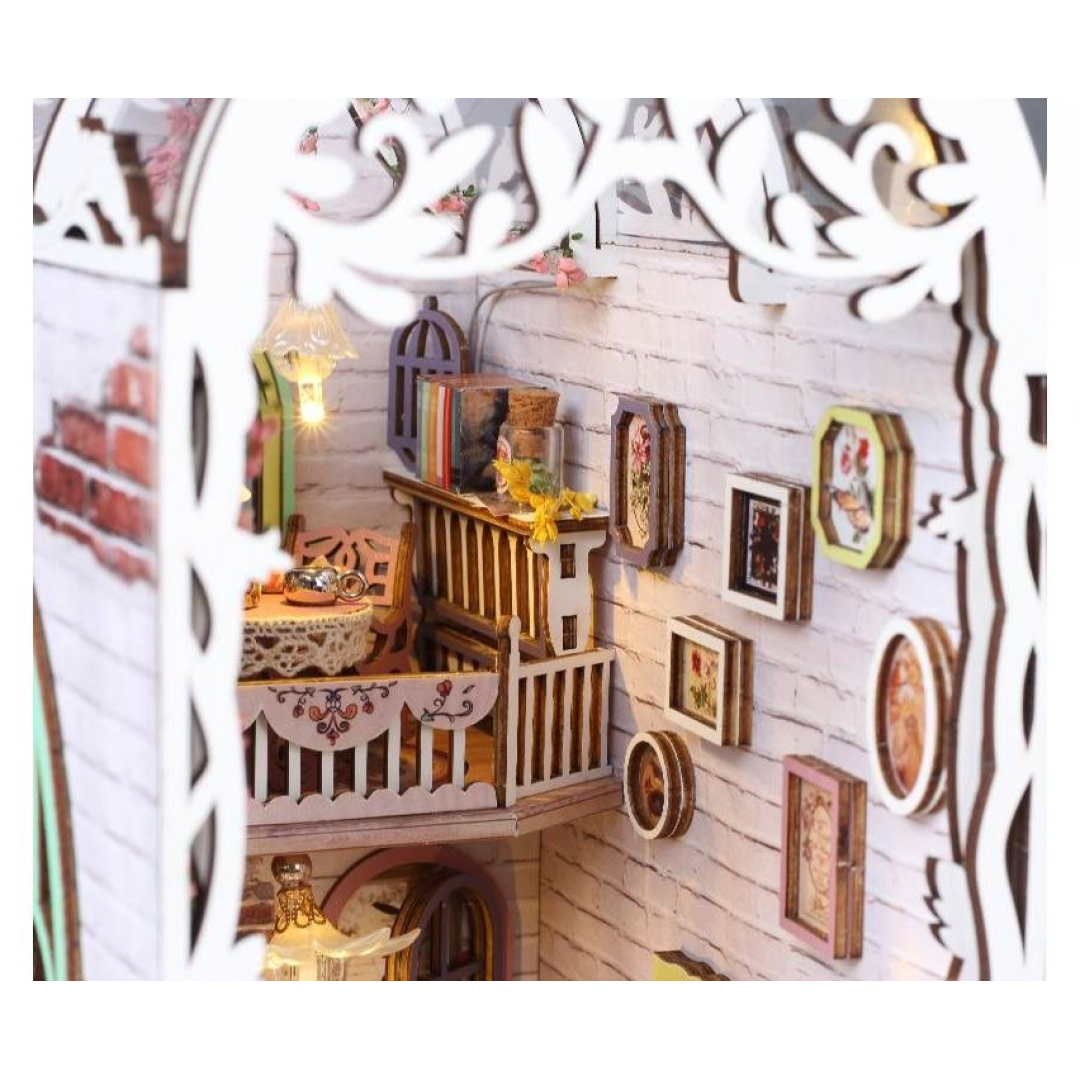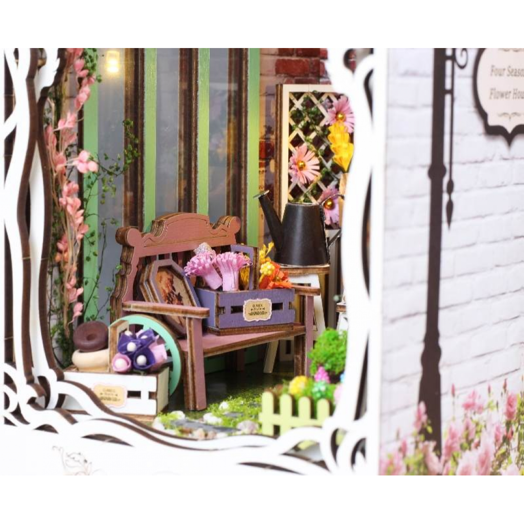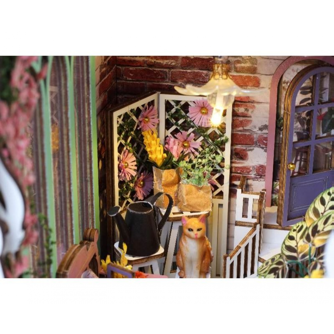 Декоративно‑тематический конструктор представляет собой набор деревянных и/или пластмассовых элементов для сборки трёхмерной мини‑диорамы — «Дом цветов» в стиле бук‑нунк (book nook). Готовый объект имеет размер 11×18×28 см и представляет собой интерьерную сцену, которую можно разместить между книг на полке или использовать как отдельный предмет декора. Сборка способствует развитию творческого мышления, усидчивости и мелкой моторики.