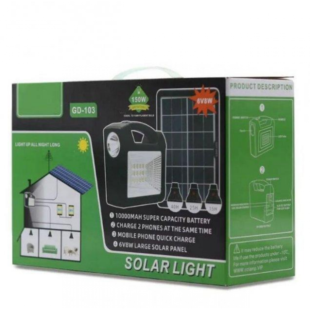 Портативная зарядная станция GD 103 предназначена для автономного освещения и зарядки мобильных устройств в условиях отсутствия электросети. Устройство оснащено встроенным аккумулятором, солнечной панелью и тремя выносными светодиодными лампами, что позволяет использовать систему как источник света и энергии в походах, на даче, в палатках или при отключениях электричества.