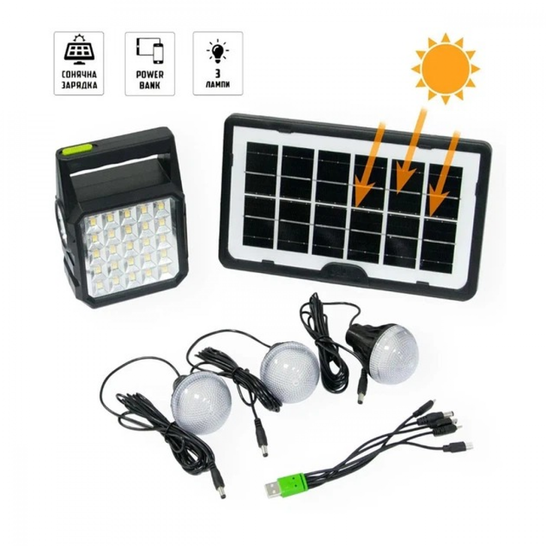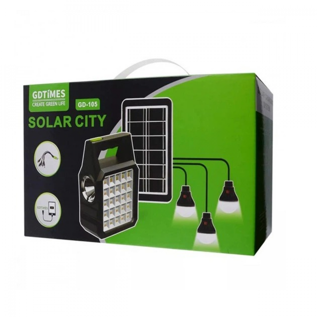 Портативная станция GD 105 предназначена для автономного освещения и зарядки мобильных устройств при отсутствии стационарного электроснабжения. Устройство оснащено встроенным аккумулятором, солнечной панелью и тремя выносными светодиодными лампами, что позволяет использовать систему как источник света и резервного питания в различных условиях.