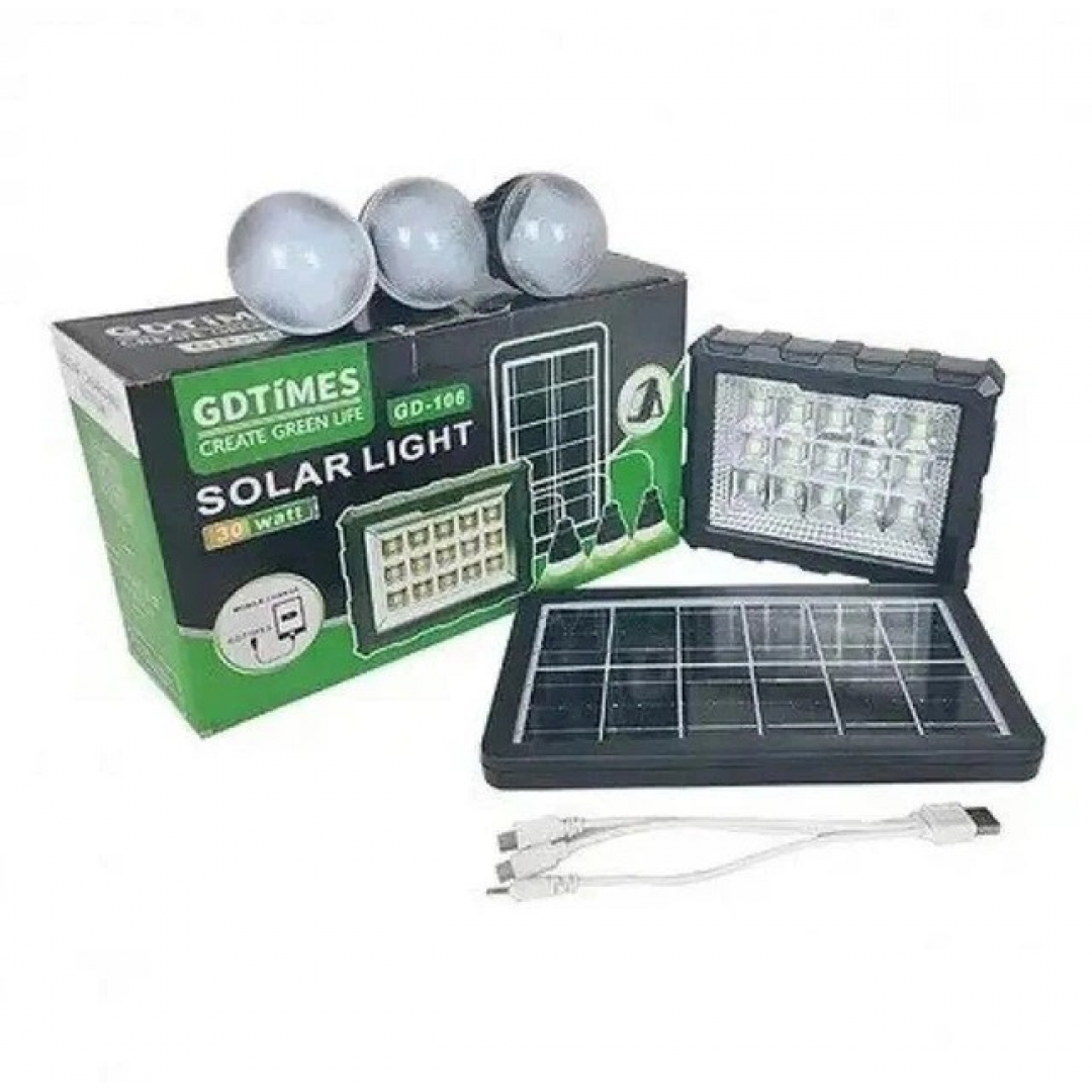 Портативная зарядная станция GD 106 предназначена для автономного освещения и зарядки мобильных устройств при отсутствии стационарного электроснабжения. Устройство оснащено встроенным аккумулятором, солнечной панелью и тремя выносными светодиодными лампами, что позволяет использовать систему как источник света и дополнительный источник питания.