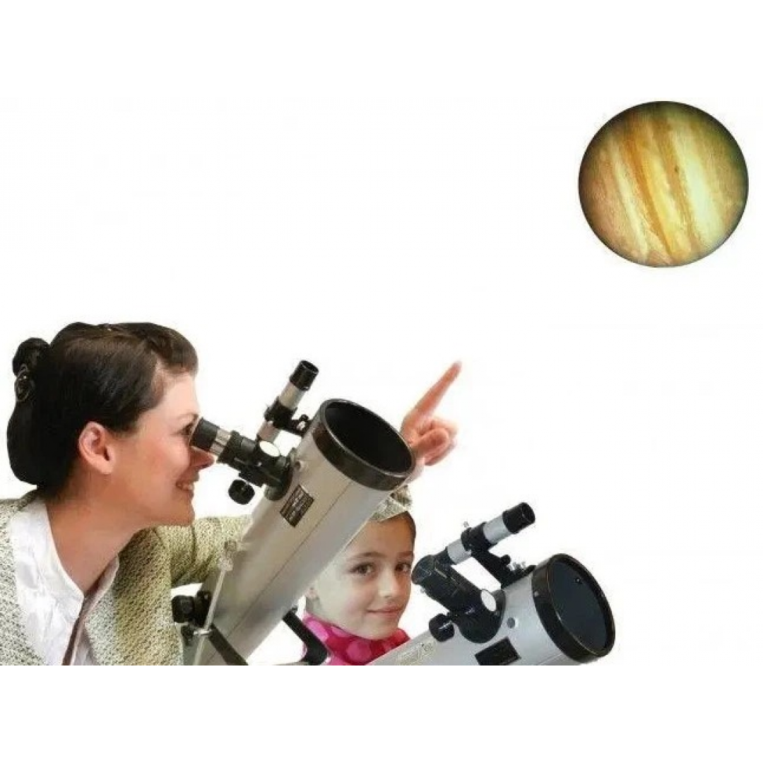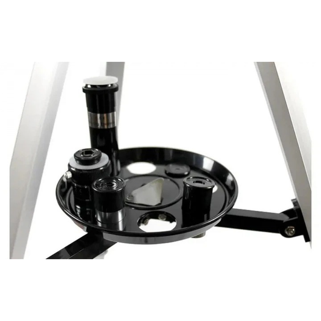Фокусное расстояние 700 мм обеспечивает достаточное увеличение для базовых астрономических наблюдений. Телескоп устанавливается на регулируемый штатив, а комплект сменных окуляров и линзы Барлоу позволяет изменять увеличение в зависимости от задачи наблюдения.