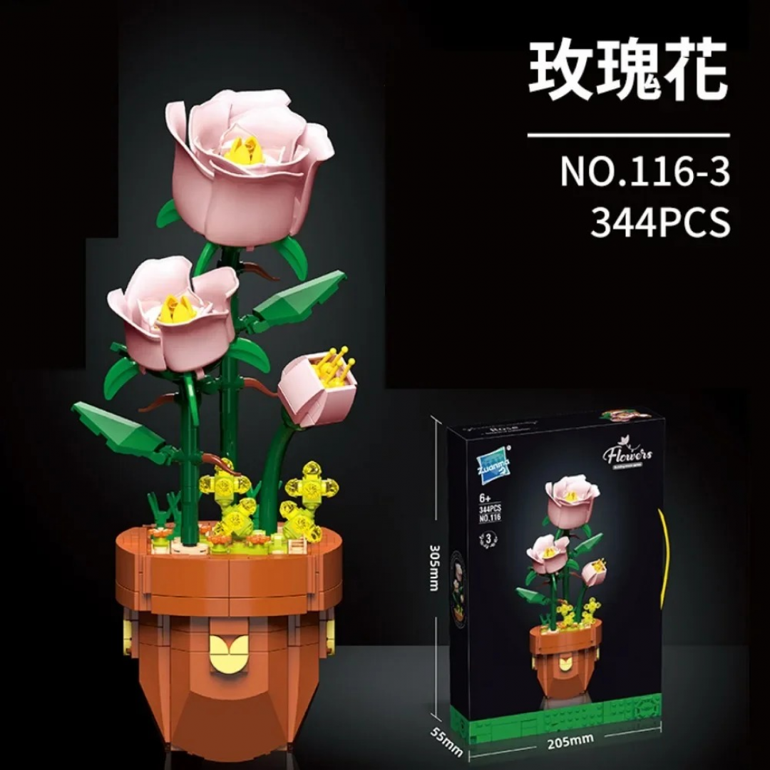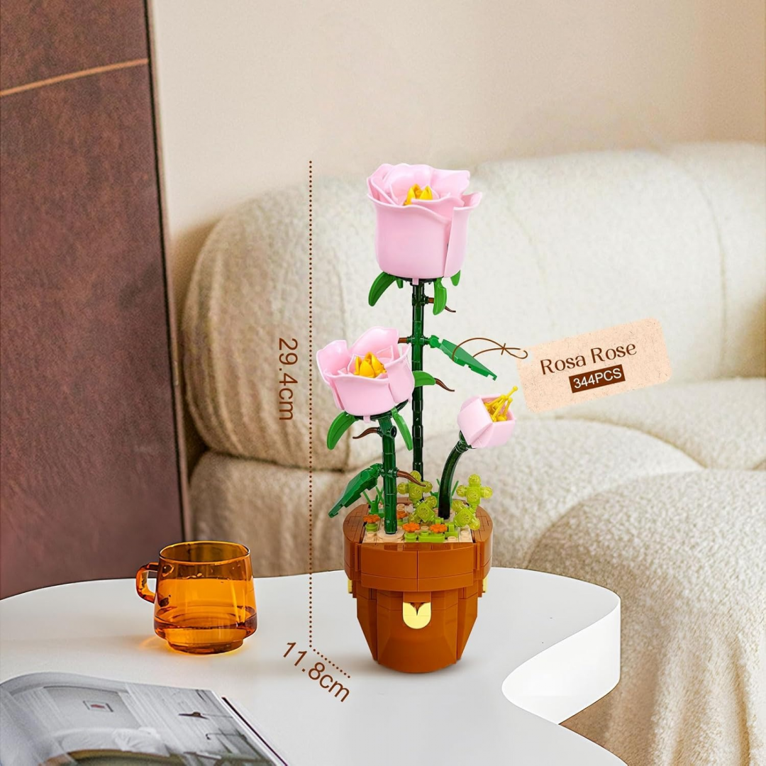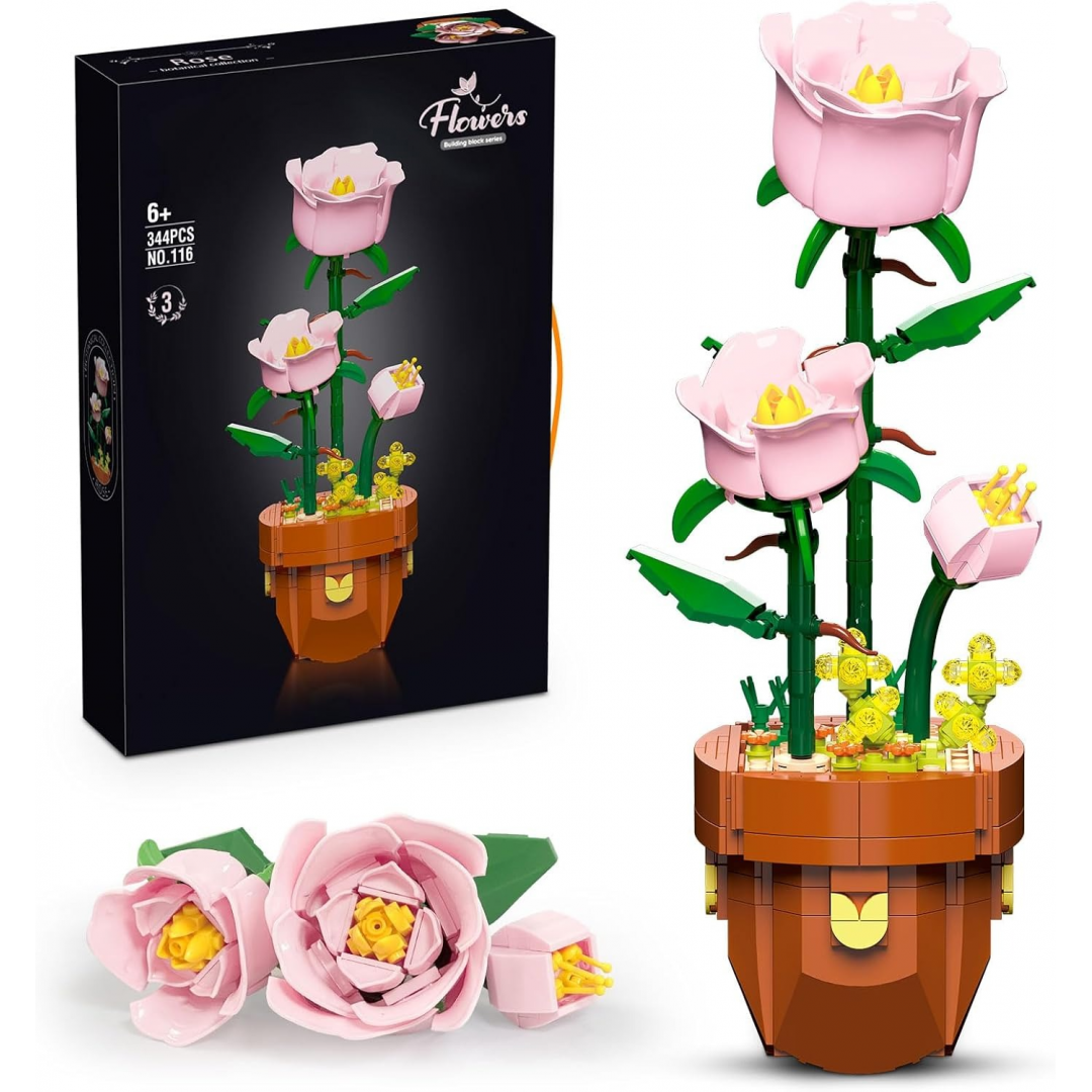 Конструктор «Розовые розы» представляет собой декоративную модель растения, собираемую из отдельных элементов конструктора. После сборки формируется композиция из нескольких розовых цветов и бутонов, размещённых в цветочном горшке.