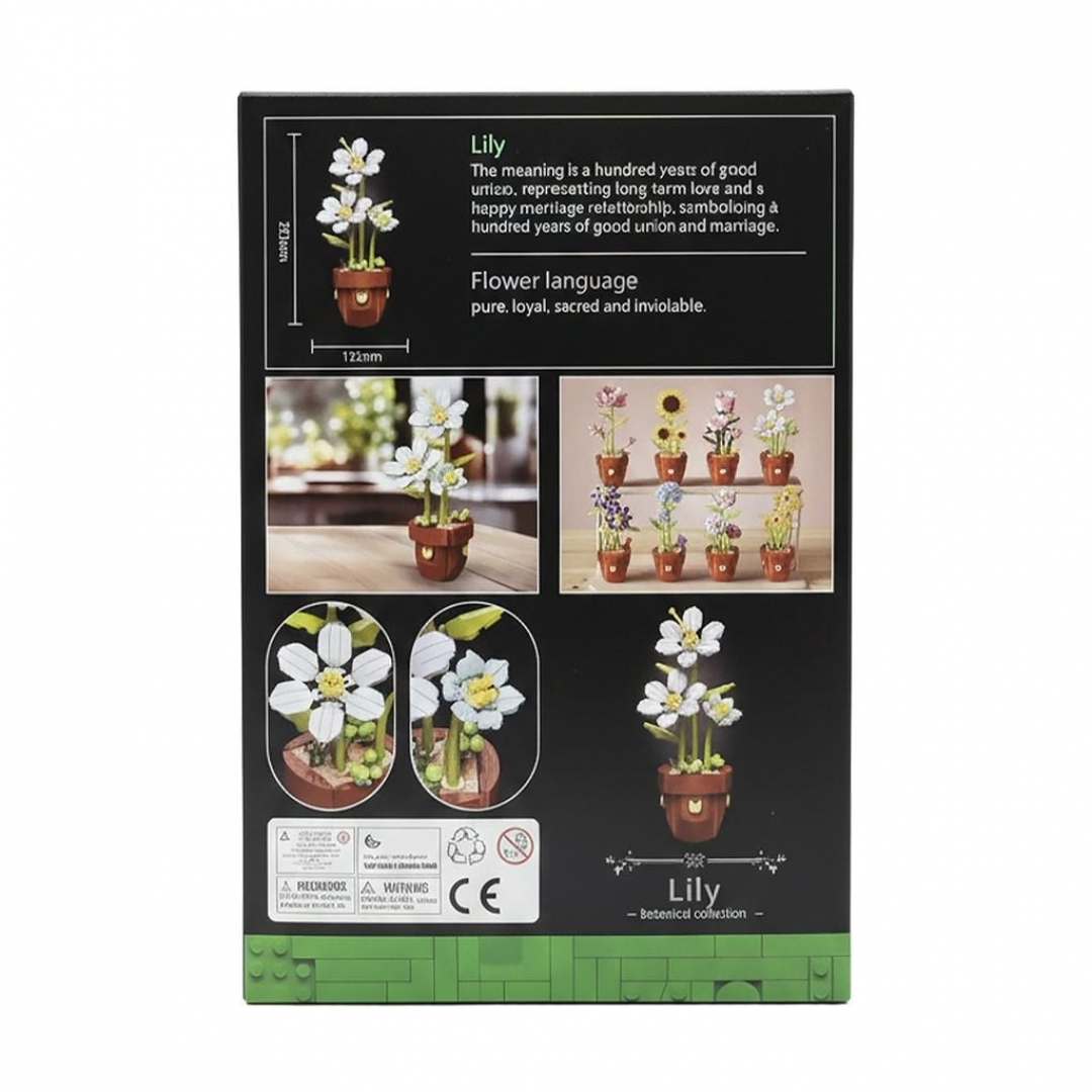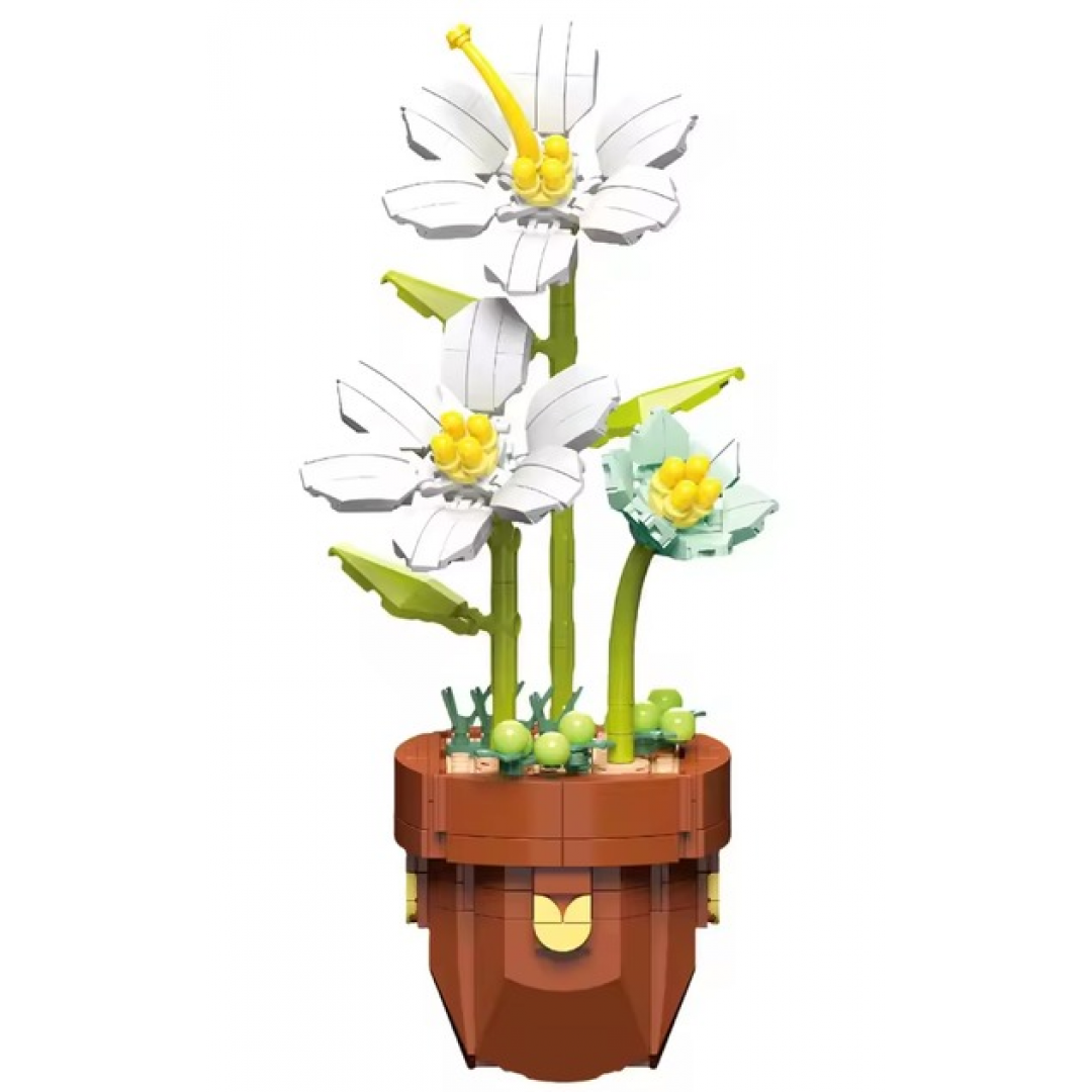 Конструкция состоит из отдельных деталей, из которых формируется горшок, стебли и цветы. Детализированная сборка передаёт форму лепестков, тычинок и листьев, создавая аккуратную декоративную композицию. Подходит для любителей конструкторов и тематических цветочных моделей.