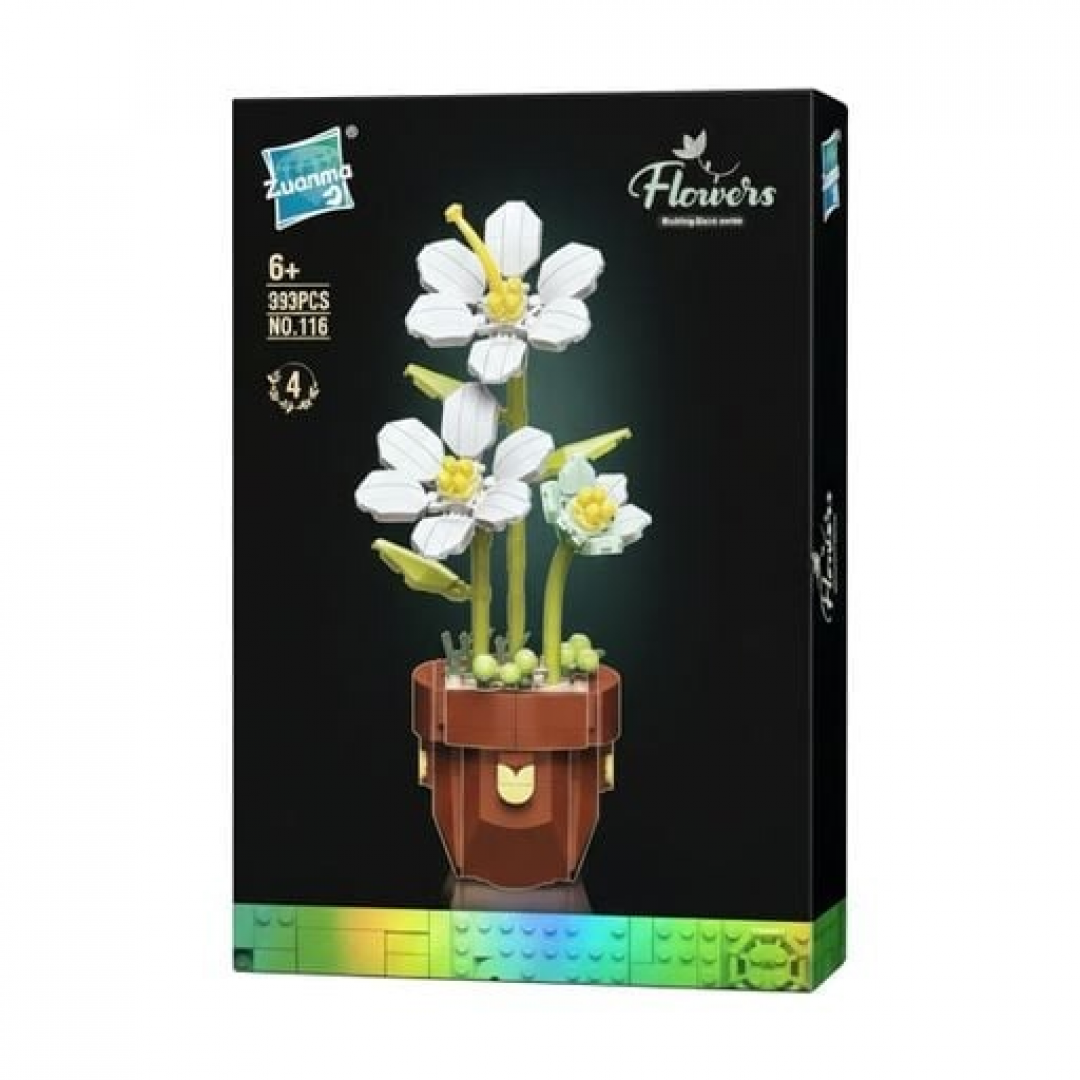 Декоративный конструктор в виде композиции из белых лилий в цветочном горшке. Набор позволяет собрать реалистичную модель цветущего растения с несколькими стеблями, листьями и раскрытыми цветами. После сборки модель может использоваться как элемент декора для комнаты, рабочего стола или витрины.