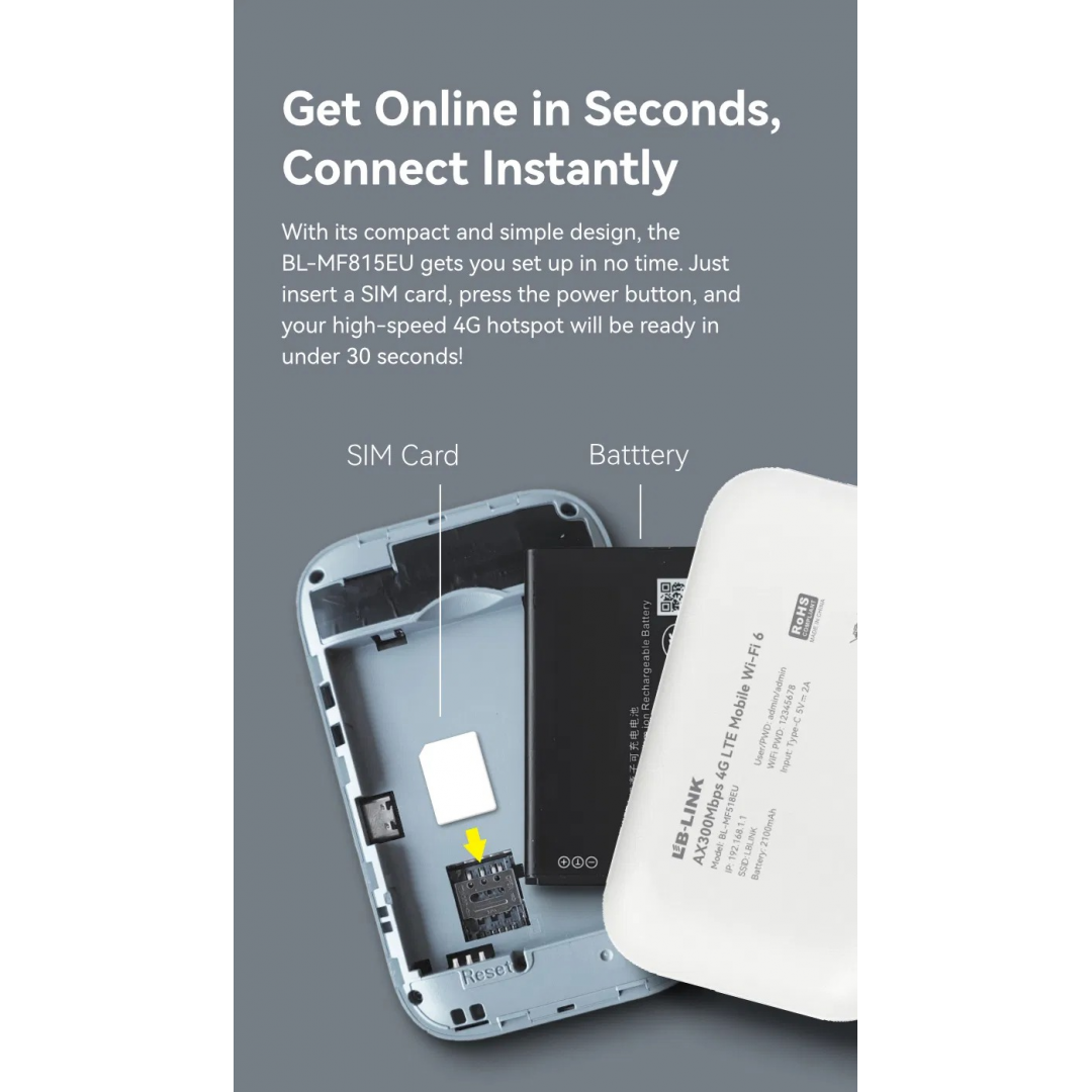 Мобильный 4G LTE Wi-Fi роутер LB-LINK BL-MF518EU, до 300 Мбит/с, Wi-Fi 6, аккумулятор 2100 мА·ч