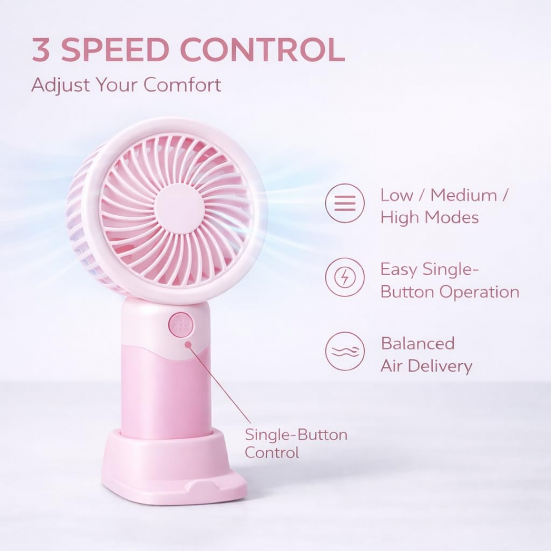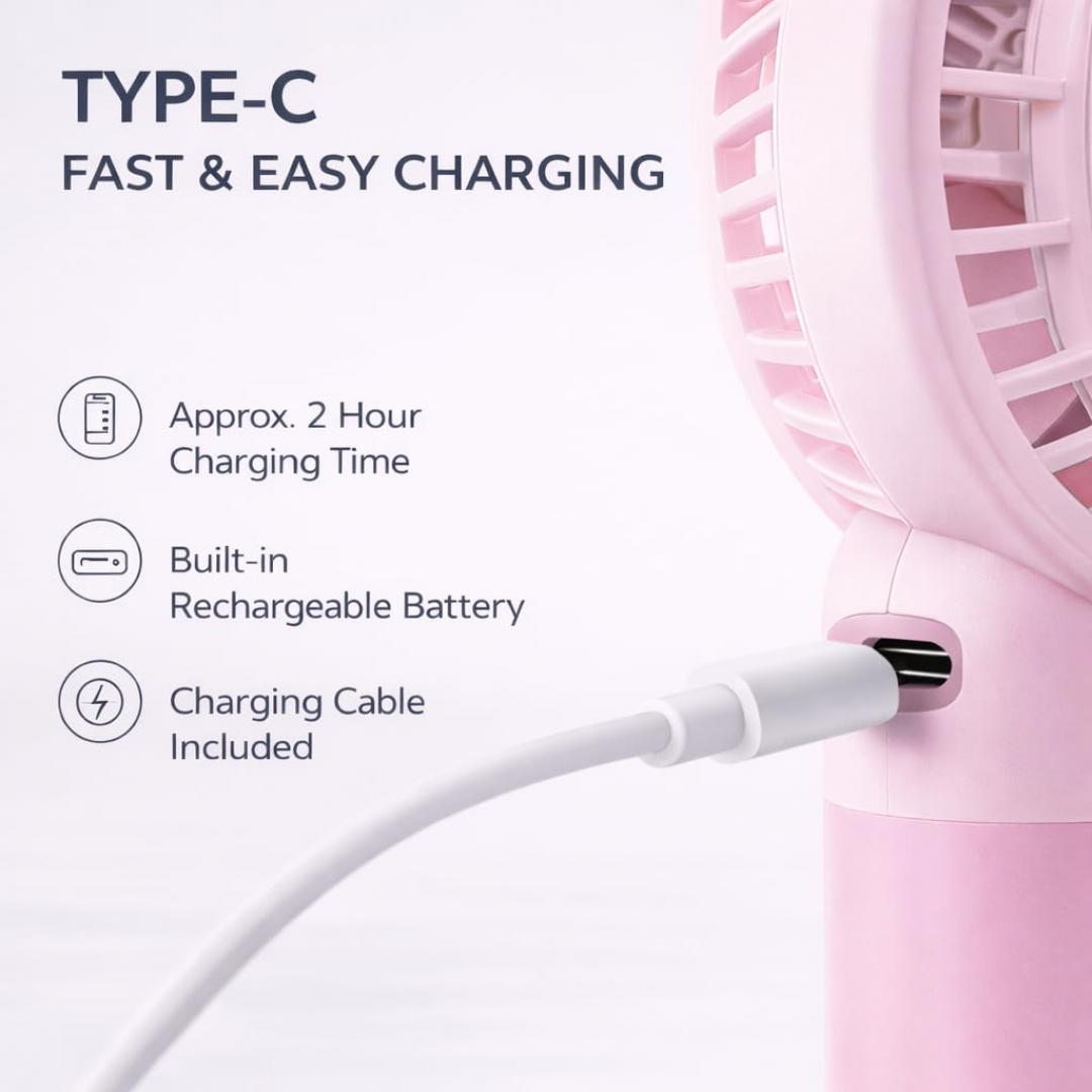 Вентилятор оснащён встроенным аккумулятором с возможностью зарядки через разъём Type-C. Поддержка трёх режимов скорости позволяет регулировать интенсивность обдува в зависимости от условий использования. Компактный корпус удобен для переноски и повседневного применения.